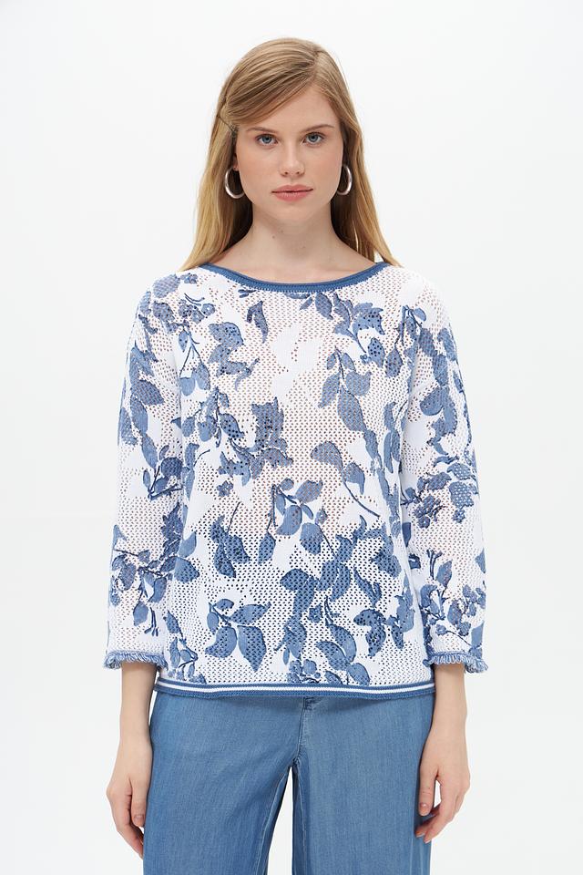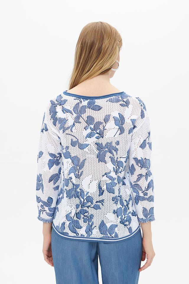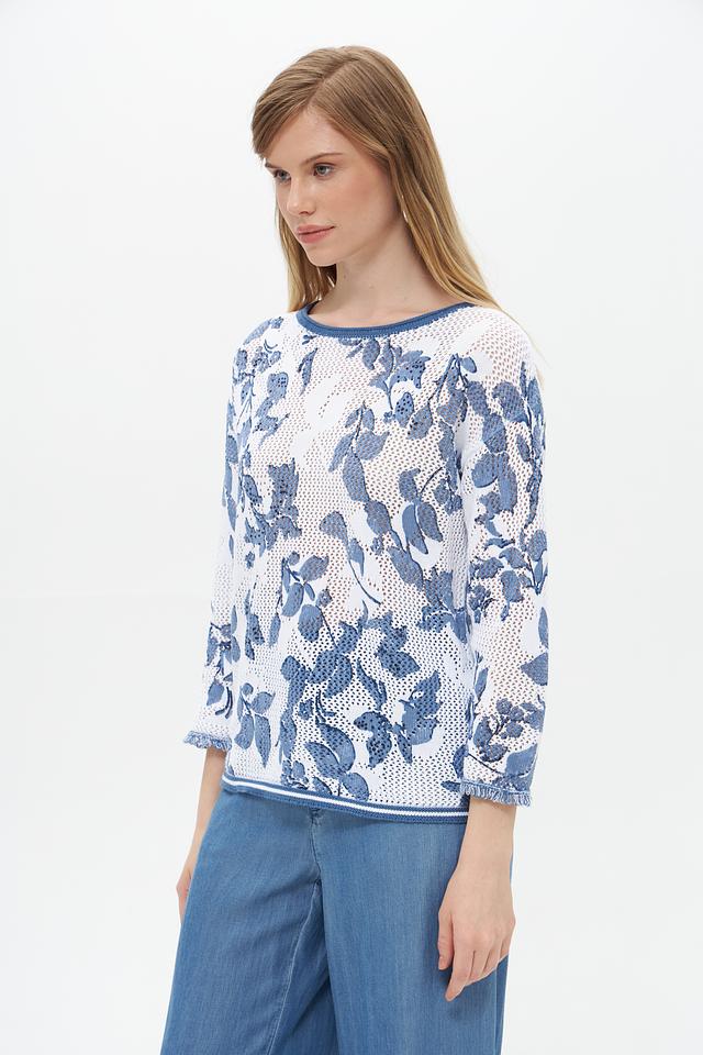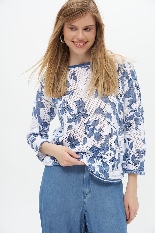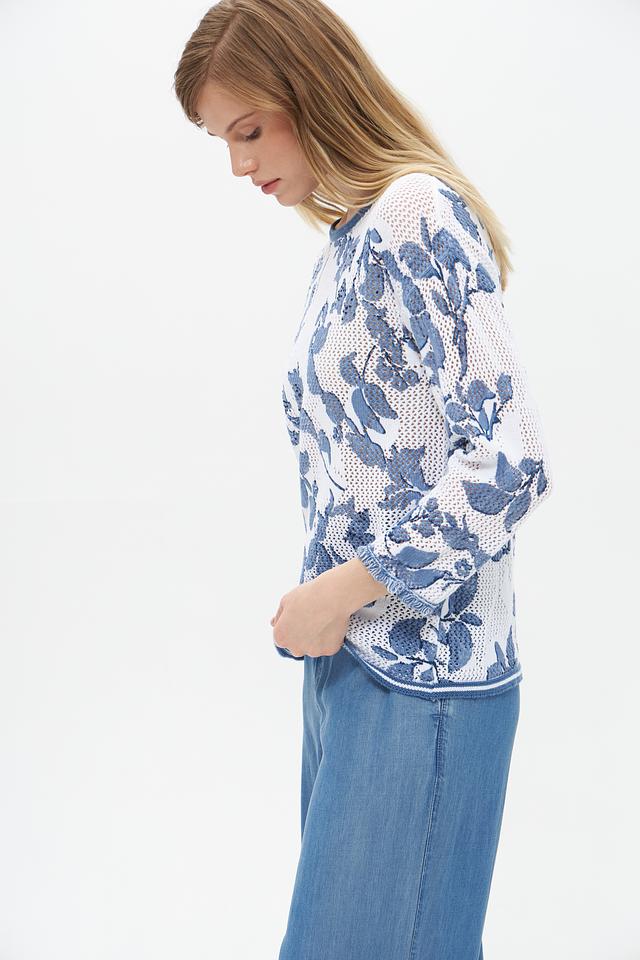 Пуловер имеет лёгкий, воздушный дизайн благодаря ажурной вставке, которая придает ему изысканность. Цветочный принт в голубых тонах добавляет образу романтичности и свежести. Округлый вырез горловины и короткие рукава делают этот пуловер идеальным для тёплой погоды.