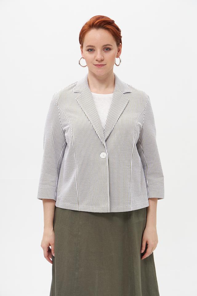 Этот жакет от Rabe collection станет отличным дополнением к вашему гардеробу. Модель выполнена в серой полоску, что делает ее универсальной и легко сочетаемой с различными вещами.