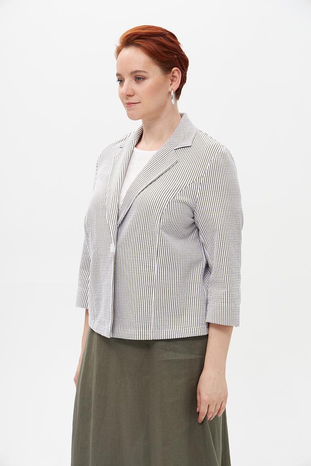 Жакет имеет классический крой с лацканами, застегивается на одну пуговицу. Укороченная длина и рукава ¾ придают образу современный и легкий вид. Состав ткани включает хлопок, полиэстер и эластан, что обеспечивает комфорт в носке, хорошую посадку и устойчивость к сминанию.