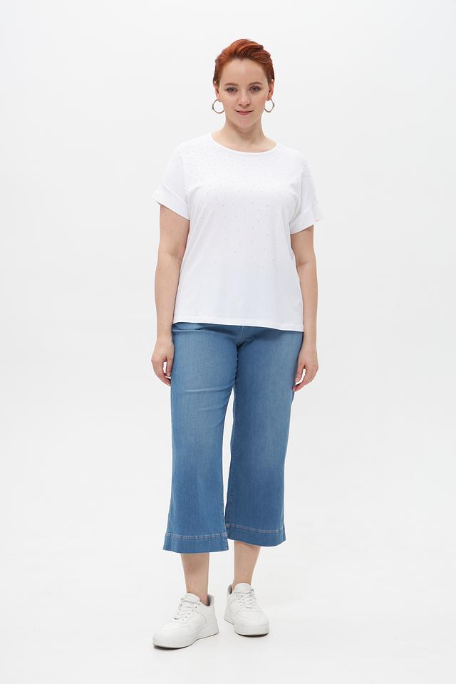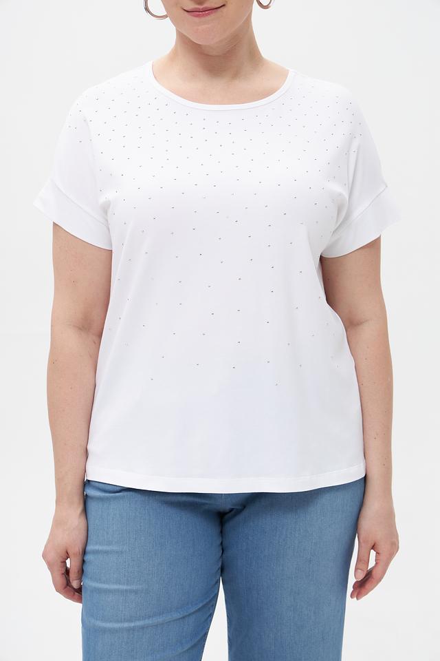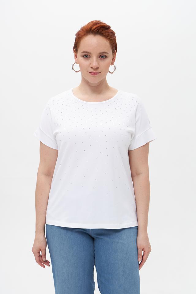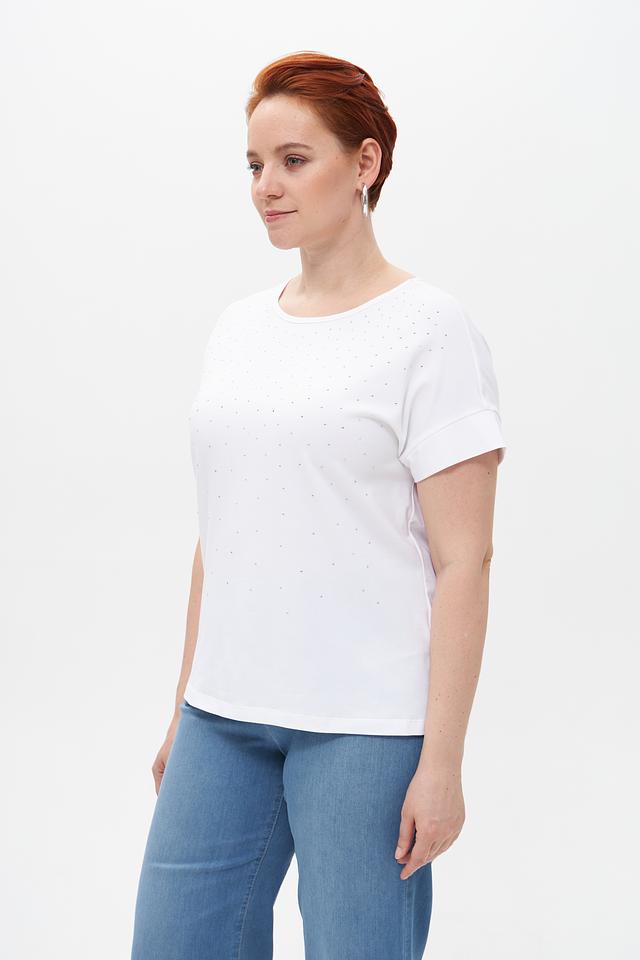 Особенностью данной футболки является декор в виде мелких камней, которые аккуратно расположены по всей поверхности изделия, добавляя ему изысканности и блеска. Футболка изготовлена из высококачественного материала, в состав которого входит 48% хлопка, 48% модала и 4% эластана.