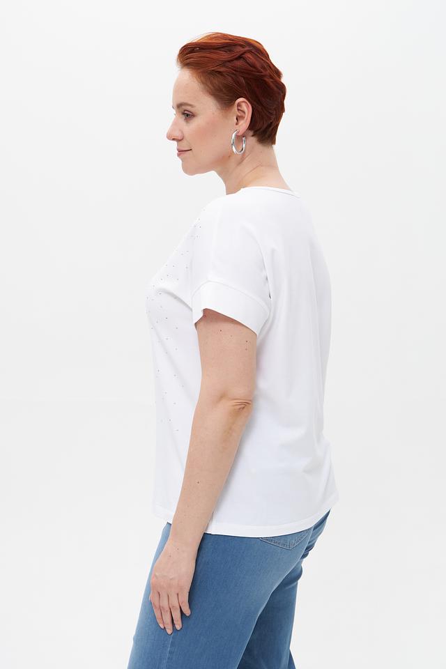 Белая футболка от Rabe collection, украшенная декоративными камнями, станет отличным дополнением к вашему гардеробу. Модель выполнена из мягкого и приятного к телу сочетания хлопка, модала и эластана, обеспечивая комфорт в носке. Состав: хлопок 48%, модал 48%, эластан 4%
