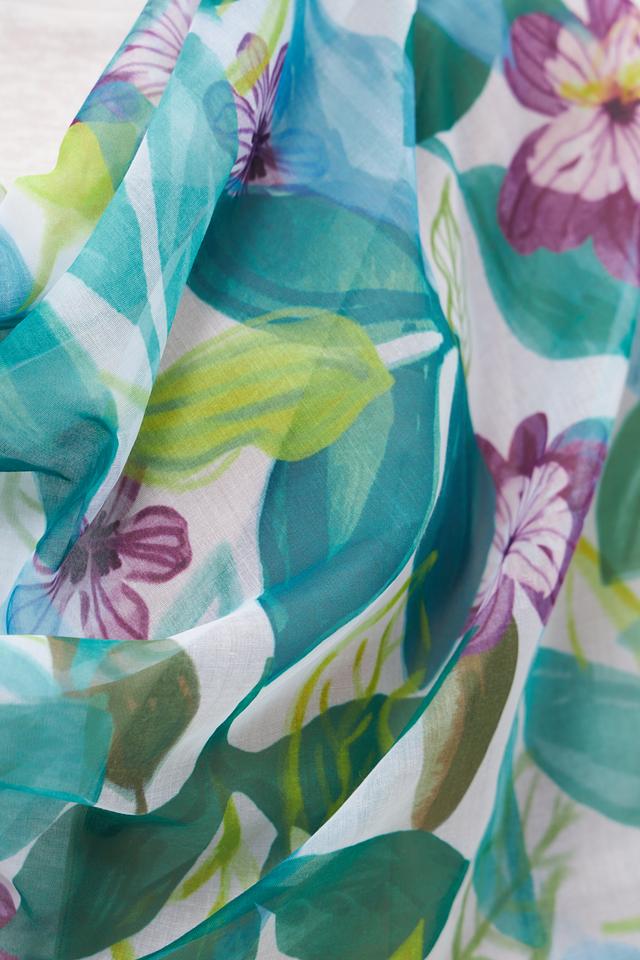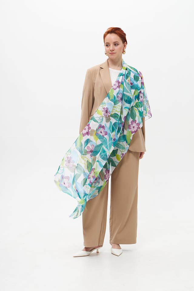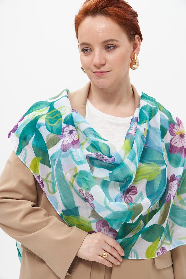 Изысканный шарф от бренда Rabe collection, выполненный в светлой бирюзовой цветовой гамме, украшен эффектным цветочным принтом. Нежные оттенки фиолетового, зелёного и белого гармонично сочетаются на фоне, создавая яркий и запоминающийся образ.