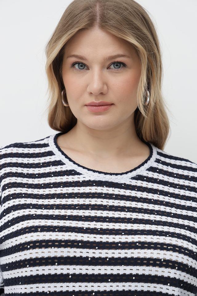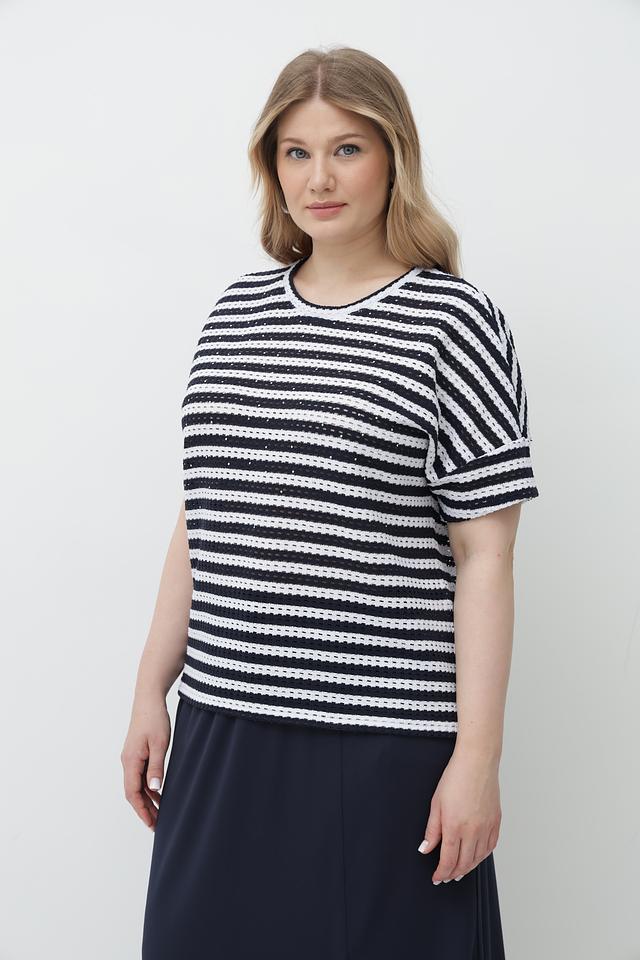 Женская футболка Rabe collection сине-белого цвета с короткими рукавами и круглым вырезом горловины. Изготовлена из мягкого трикотажа с добавлением хлопка и полиэстера, обеспечивающего комфорт и удобство в носке. Состав: хлопок 47%, полиэстер 47%, эластан 6%
