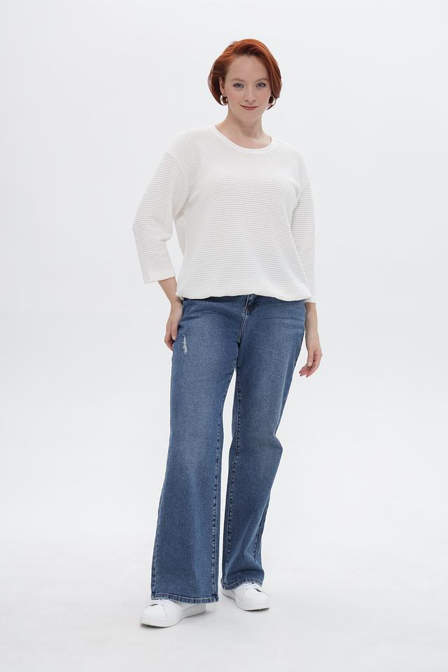 Блузка имеет круглый вырез горловины и рукава длиной 3/4, что делает ее универсальной для разных сезонов. Свободный крой обеспечивает комфортную посадку по фигуре.