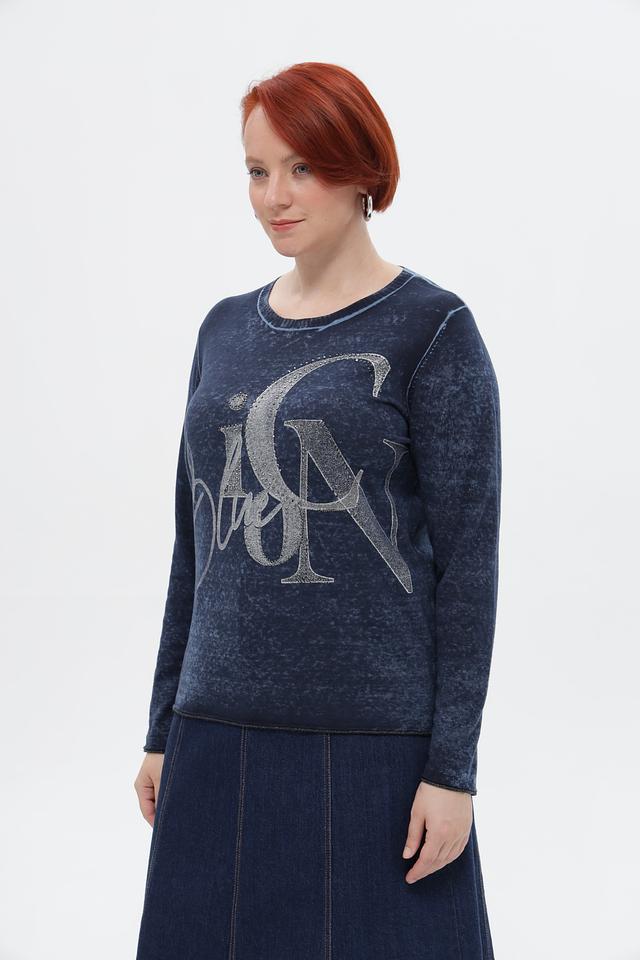 Пуловер украшен крупным логотипом, выполненным в серебристых тонах, что придает ему оригинальность и стиль. Текстура ткани слегка потертая, создающая эффект винтажности.