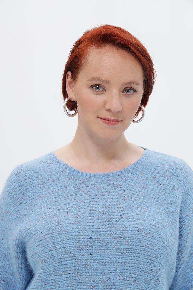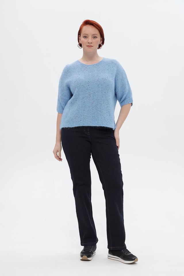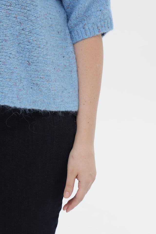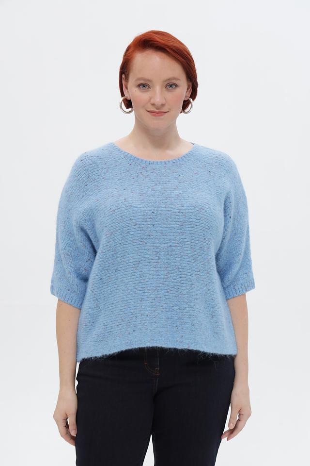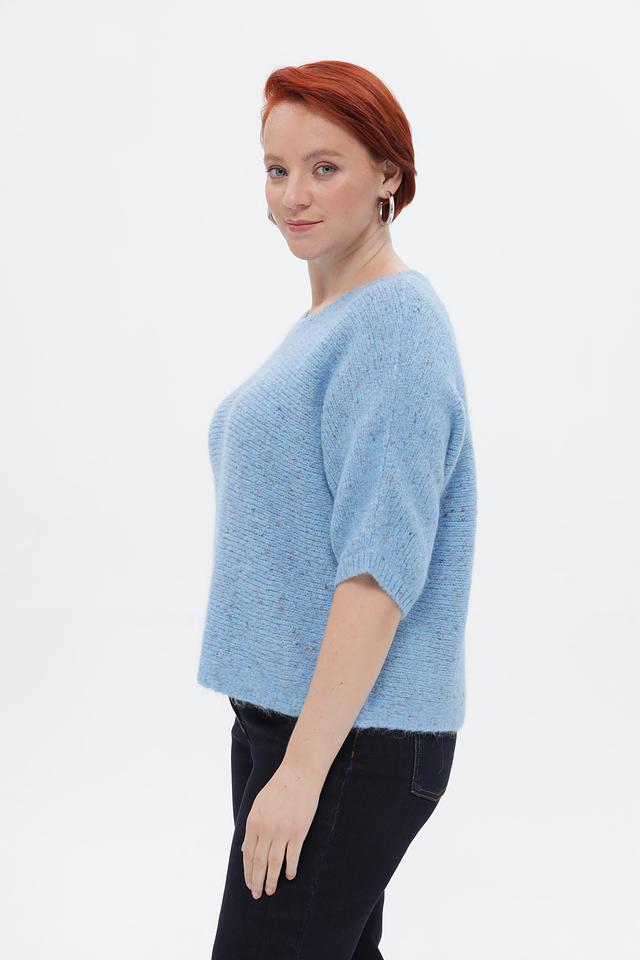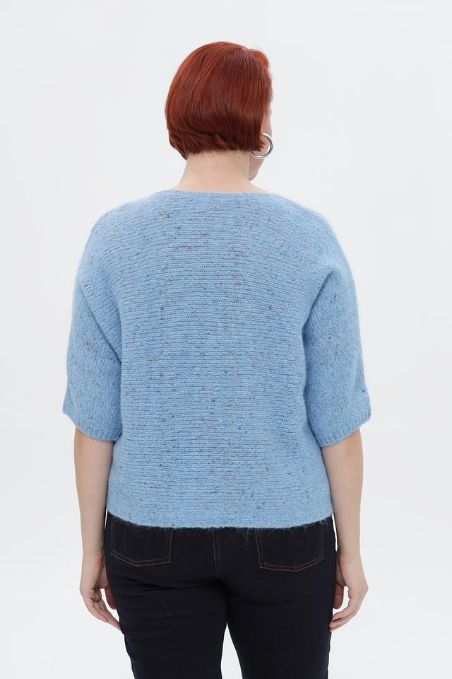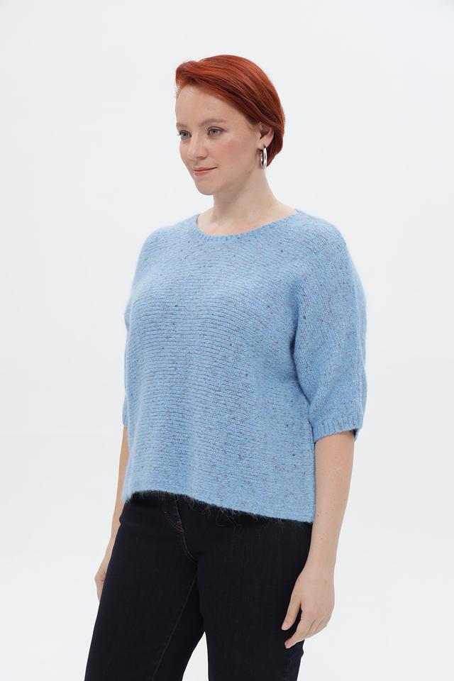 Пуловер имеет приятный голубой цвет и фактурную вязку, которая придает ему особый шарм. Короткий рукав 3/4 делает его идеальным для теплой погоды или для создания многослойных образов. Свободный крой обеспечивает комфортную посадку по фигуре.