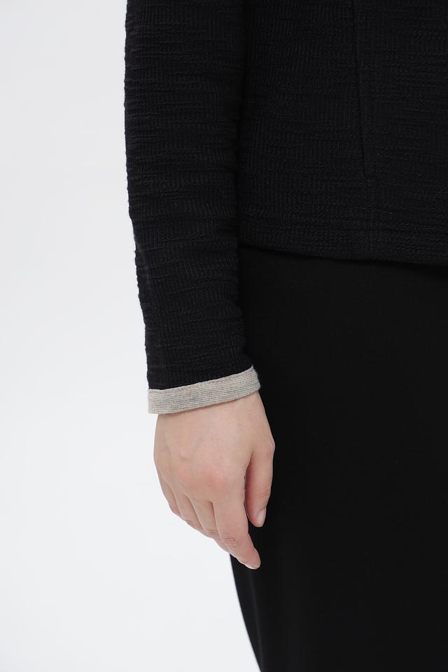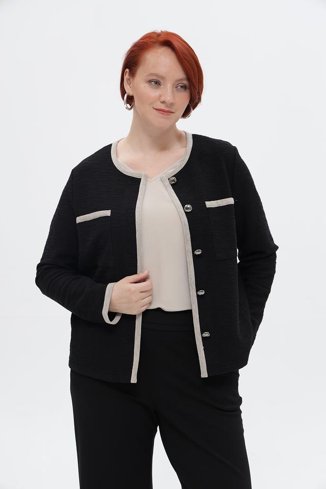Представляем элегантный жакет от бренда Rabe collection. Модель выполнена в классическом чёрном цвете с контрастной бежевой отделкой по краю, горловине, карманам и манжетам, что придаёт ей особый шарм.