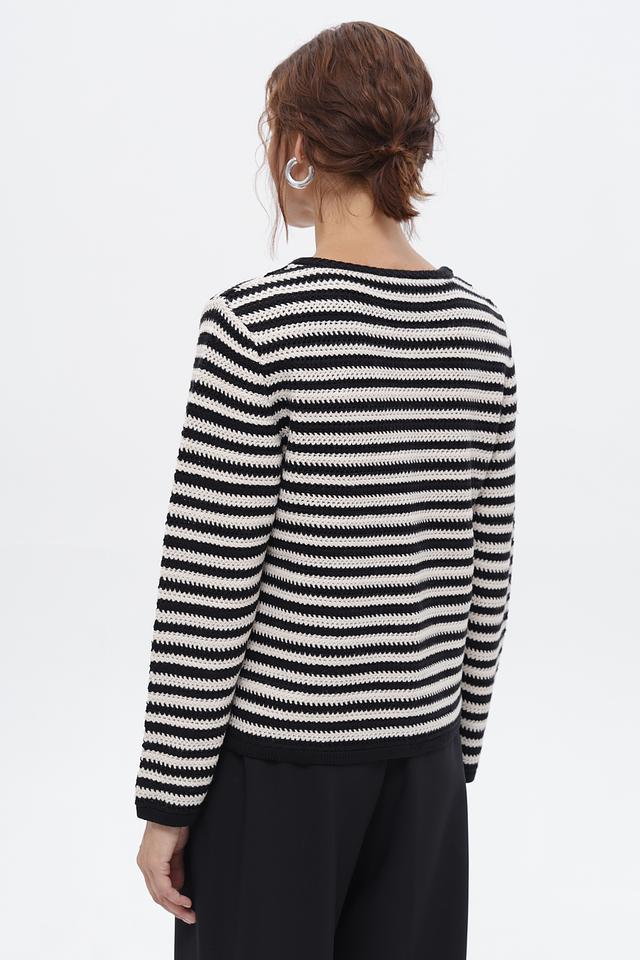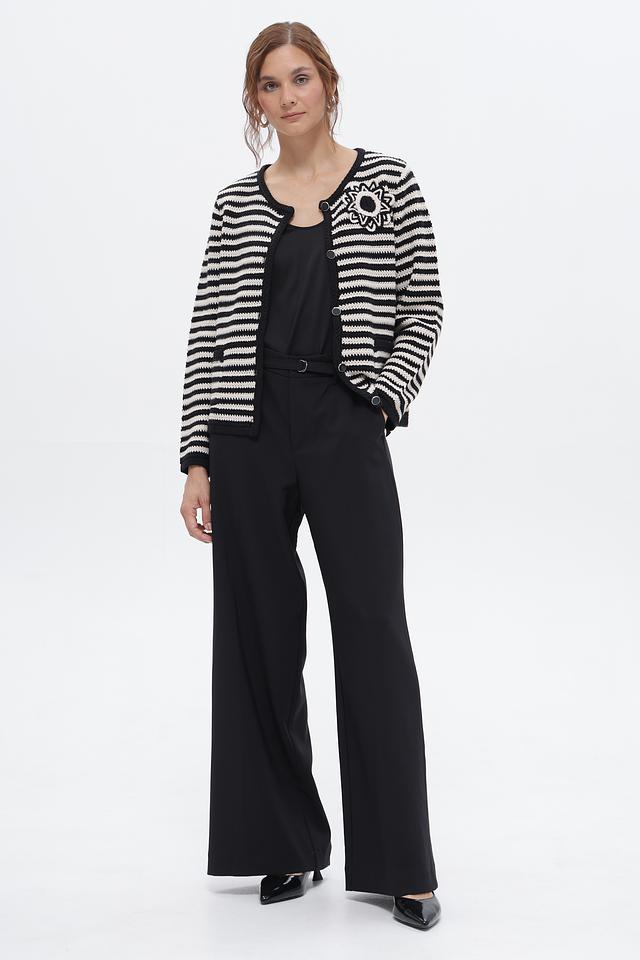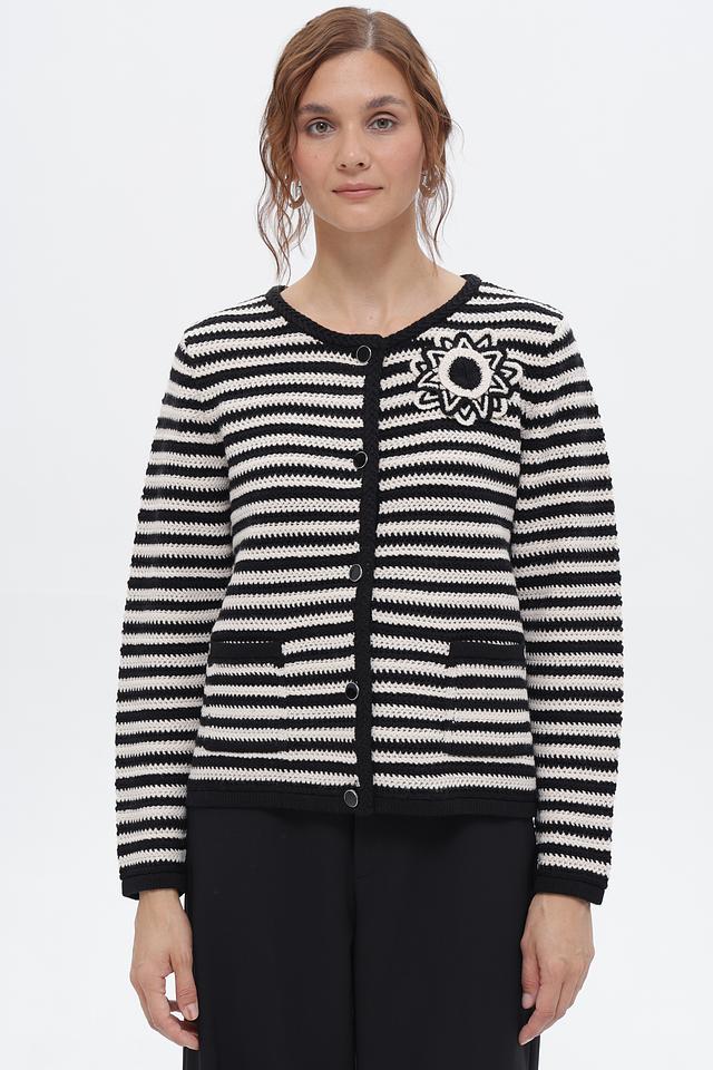 Жакет выполнен в контрастную чёрно-белую полоску, что придает ему особый шарм и универсальность. Декоративный элемент – аппликация в виде цветка – добавляет изделию изюминку и индивидуальность.