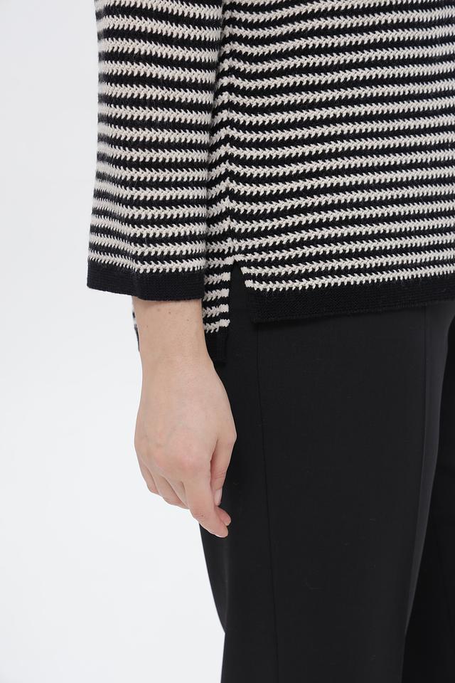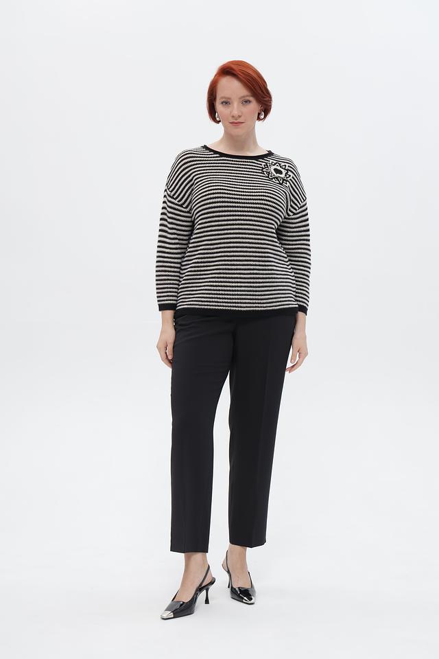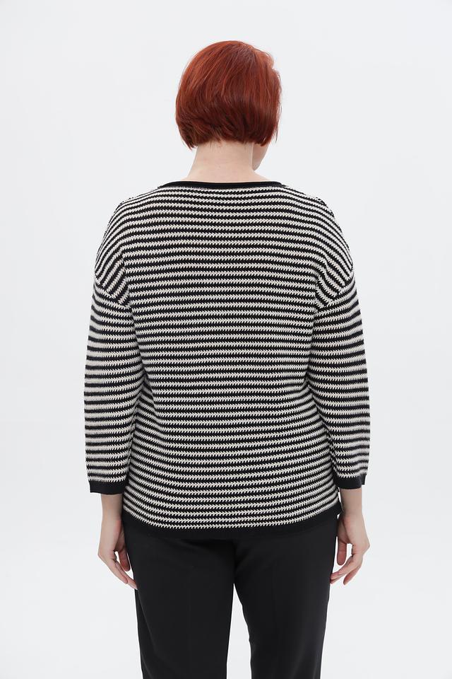 Элегантный пуловер от бренда Rabe collection станет отличным дополнением к вашему гардеробу. Модель выполнена в классическом бело-черном сочетании с вертикальным узором в полоску, визуально стройнящим силуэт.