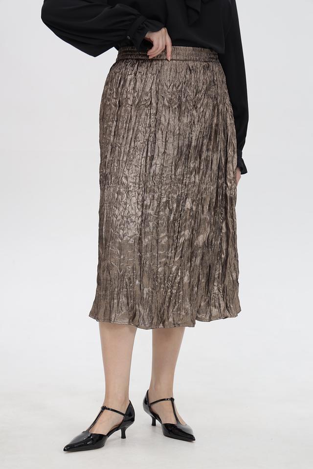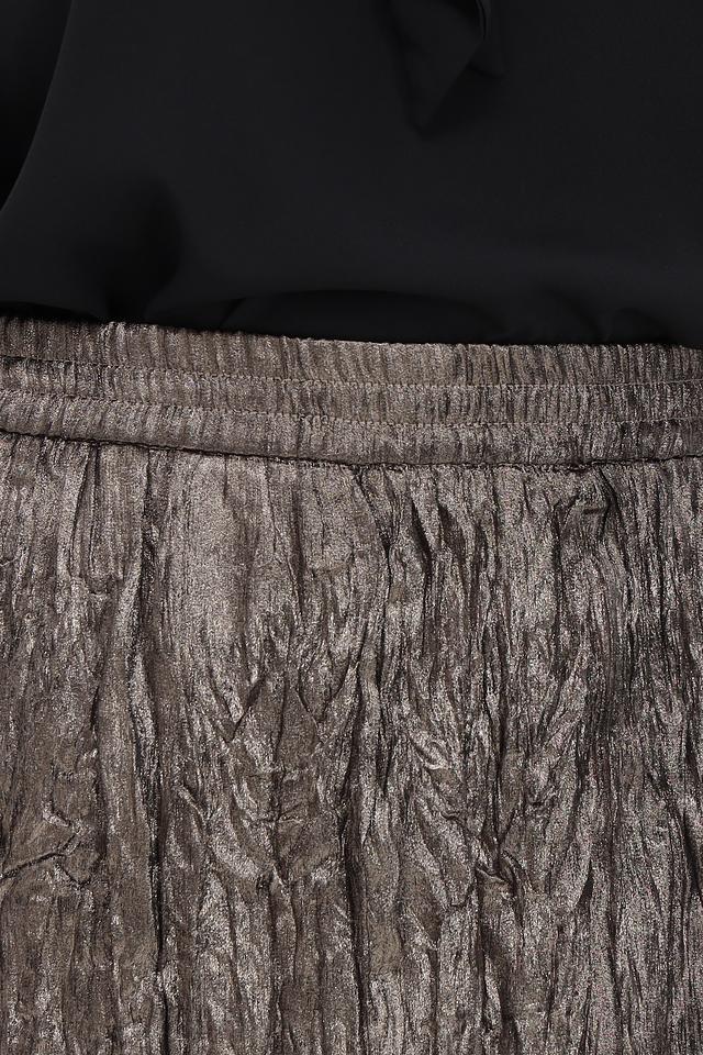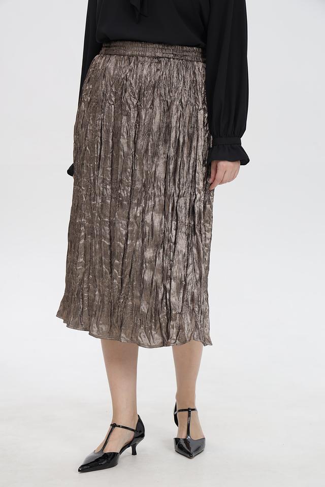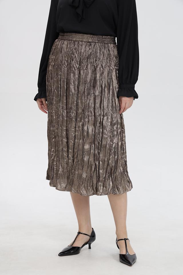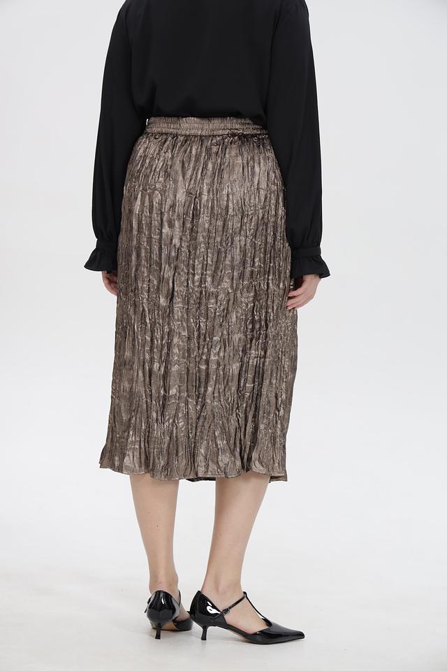 Модель выполнена в золотистом цвете, который придает образу изысканность и блеск. Плиссировка создает эффект движения и легкости, а длина миди делает юбку универсальной и подходящей для различных случаев.