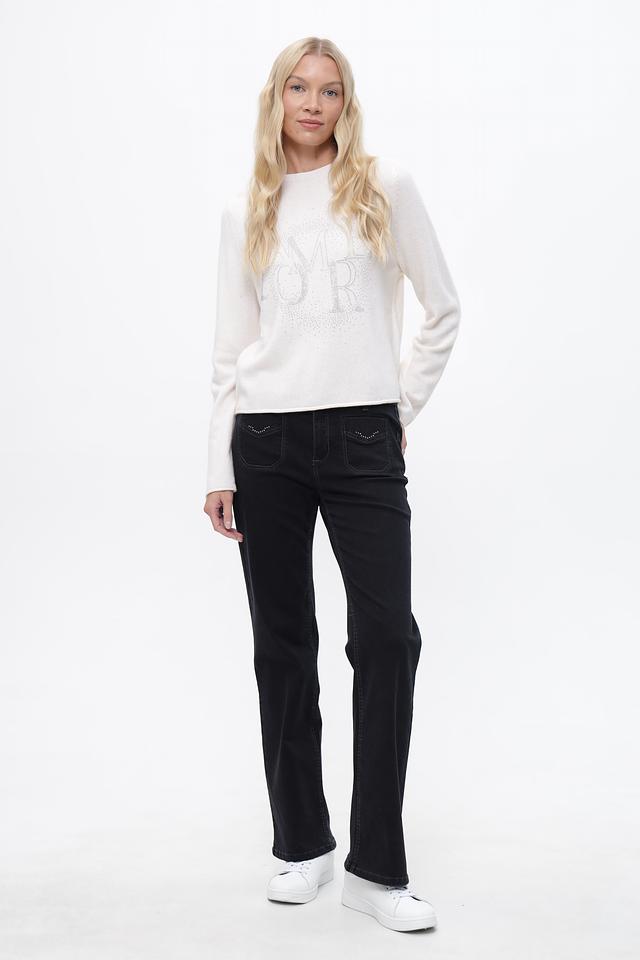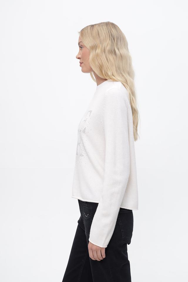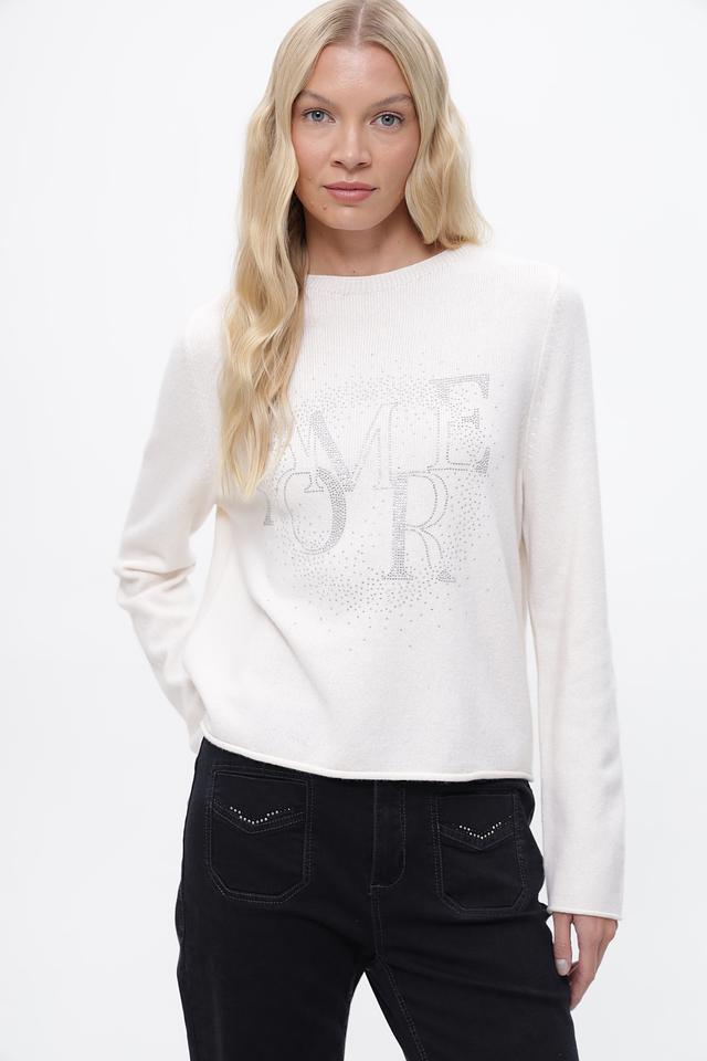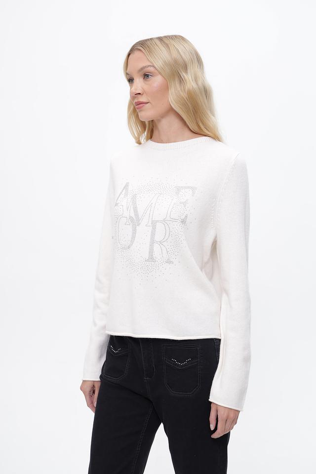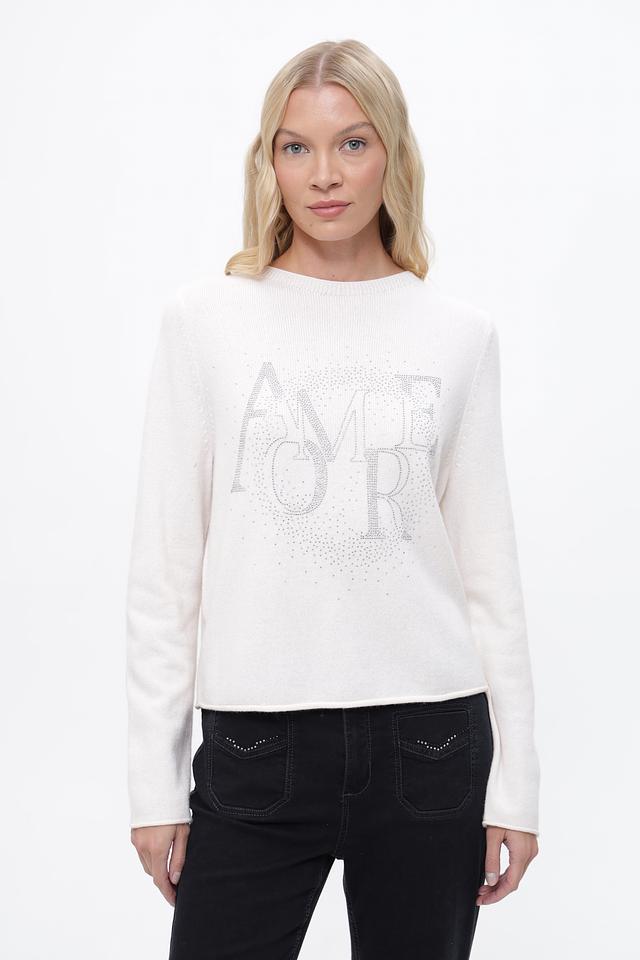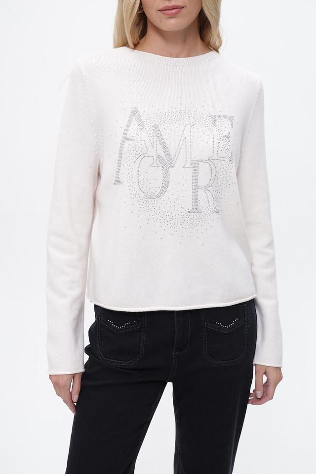Белый пуловер от Rabe collection, украшенный вышивкой в виде надписи «AMOR» с серебристыми пайетками. Изготовлен из мягкой смеси шерсти, полиамида и модала. Состав: шерсть 50%, полиамид 30%, модал 20%