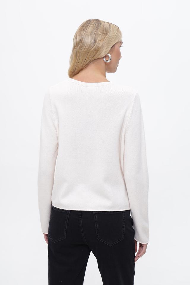 Пуловер имеет классический крой с округлым вырезом горловины и длинными рукавами. Он идеально подходит для создания как повседневных, так и более нарядных образов.