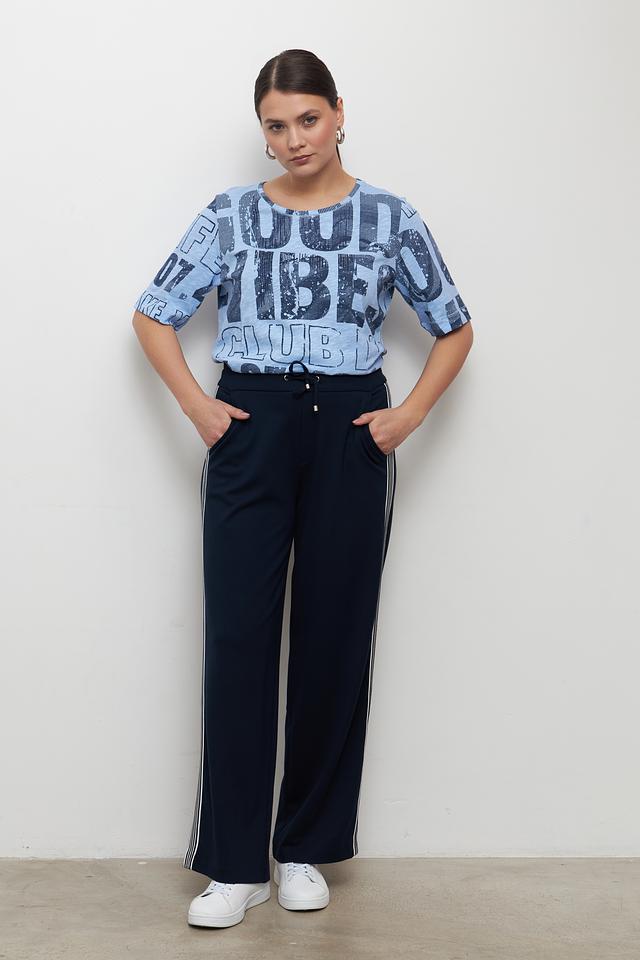 Эта футболка от Rabe collection станет отличным дополнением к вашему гардеробу. Она выполнена в нежном голубом цвете и украшена эффектным принтом с надписями в тёмно-синем цвете.