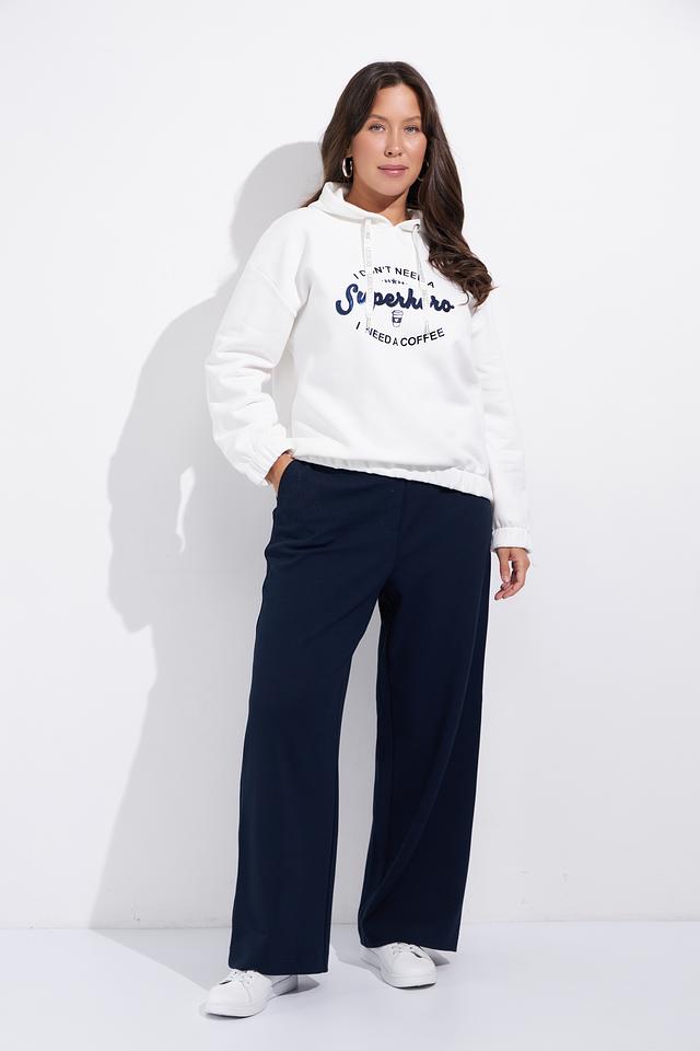 Брюки имеют широкий крой, который обеспечивает комфорт и свободу движений. Высокая посадка подчеркивает талию и создает элегантный силуэт. По бокам брюк проходит декоративная полоса, выполненная в ярких цветах, что придает им оригинальный вид.