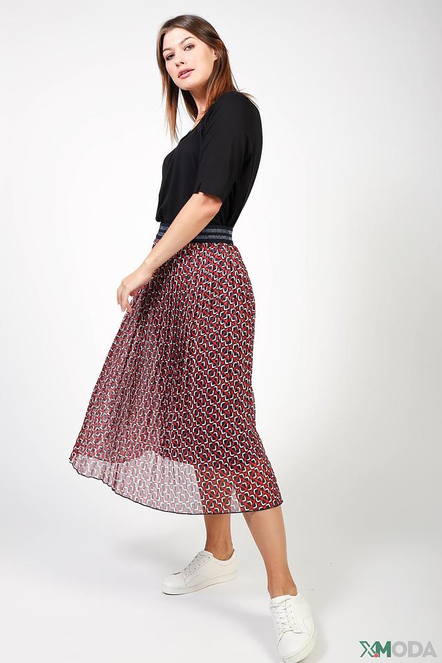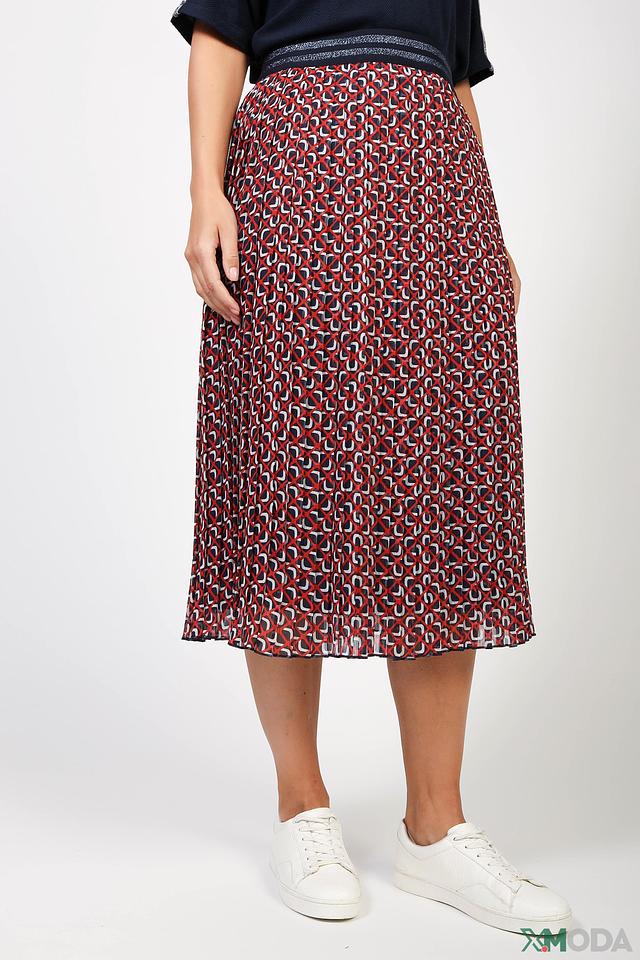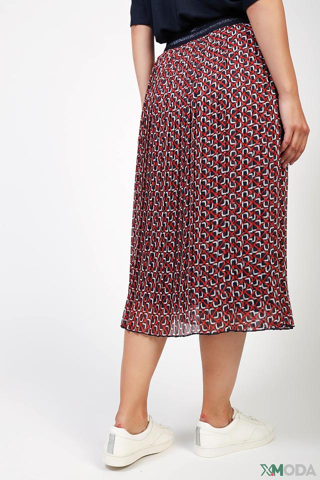 Юбка имеет длину миди и полуприлегающий силуэт. Принт, состоящий из геометрических фигур в красных, белых и синих тонах, придает изделию оригинальность и динамичность. Эластичный пояс на талии обеспечивает комфортную посадку и подчеркивает фигуру.