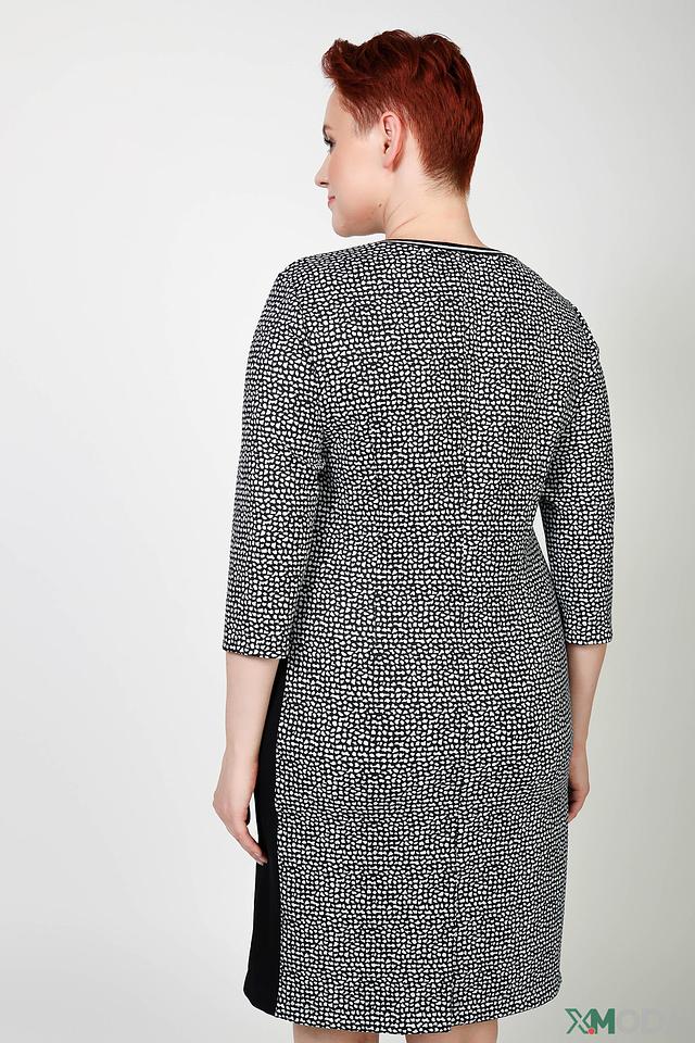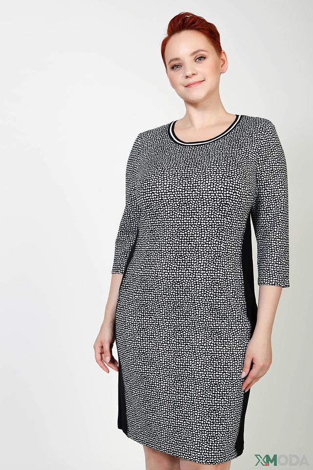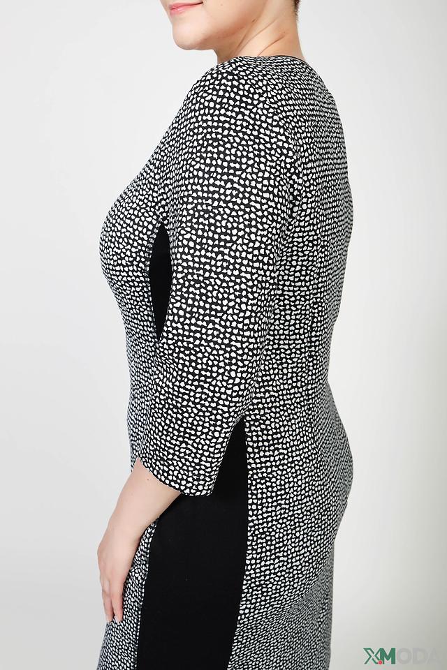 Модель с рукавами три четверти и округлым вырезом горловины. По бокам платья вставлены черные панели, которые визуально стройнят силуэт. Платье выполнено из мягкого и приятного к телу материала, в составе которого преобладает полиэстер (91%) и эластан (9%).