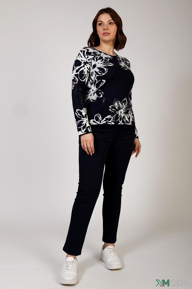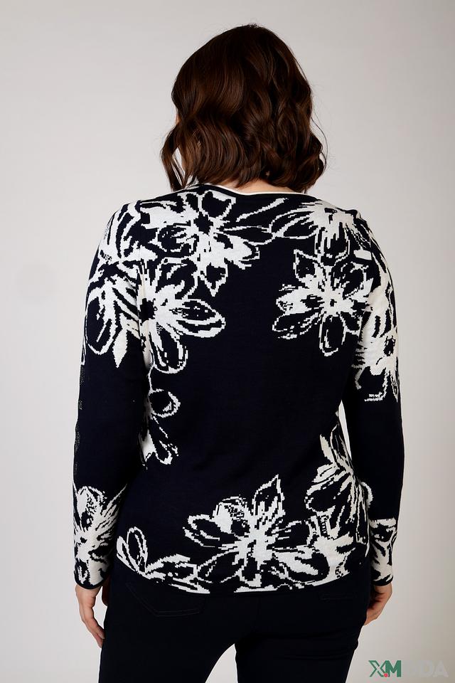 Женский пуловер Rabe collection тёмно-синего цвета с крупным цветочным принтом. Изготовлен из мягкого и приятного к телу сочетания хлопка и полиакрила, обеспечивающего комфорт и удобство в носке. Состав: хлопок 50%, полиакрил 50%