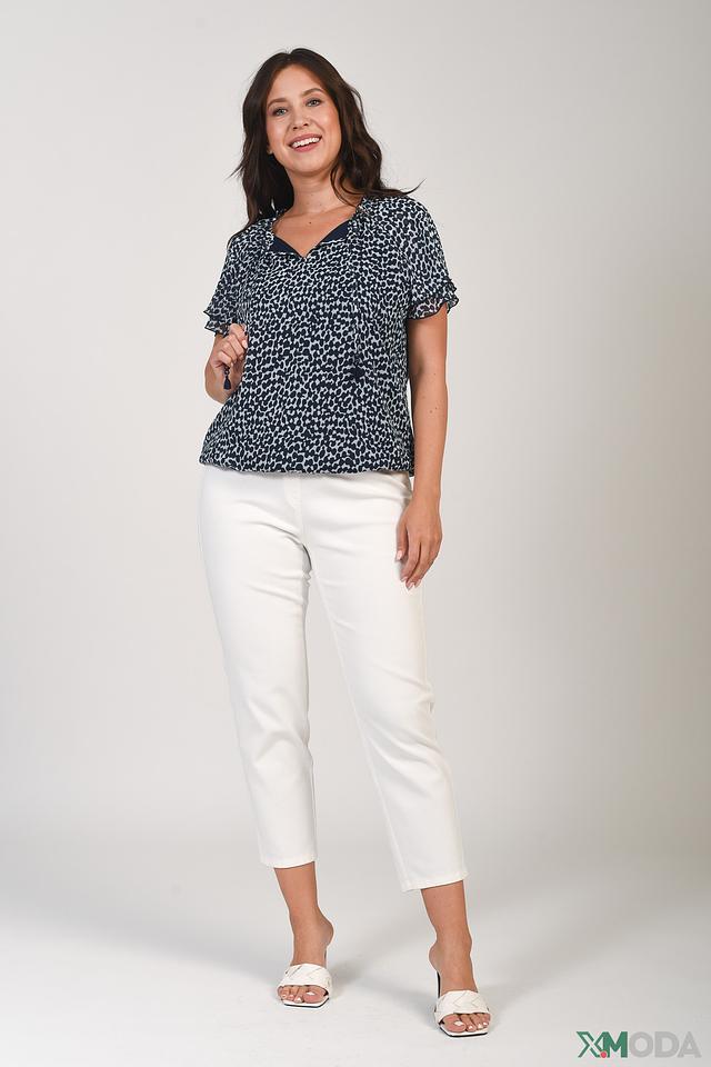 Модель имеет V-образный вырез горловины и короткие рукава с воланами, что делает её особенно женственной. Блуза выполнена из 100% полиэстера, что обеспечивает легкость и комфорт в носке. Подкладка выполнена из вискозы с добавлением эластана (92% вискоза, 8% эластан), что обеспечивает дополнительный комфорт и приятные ощущения на коже.