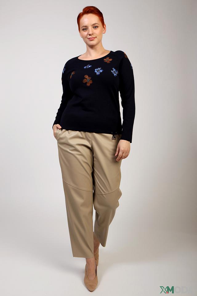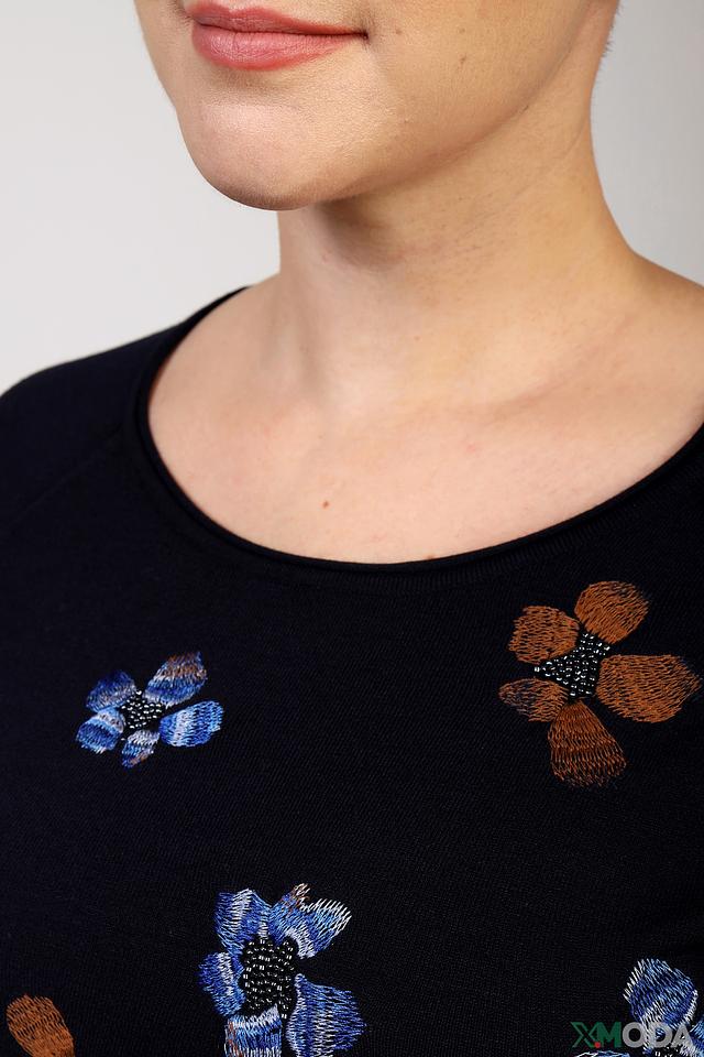 Вышивка выполнена в виде небольших цветов, сочетающих в себе оттенки синего, коричневого и голубого. Пуловер имеет длинные рукава, обеспечивающие комфорт в прохладную погоду. Материал – сочетание вискозы (72%) и полиэстера (28%), что обеспечивает мягкость, приятные тактильные ощущения и простоту в уходе.