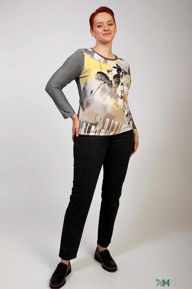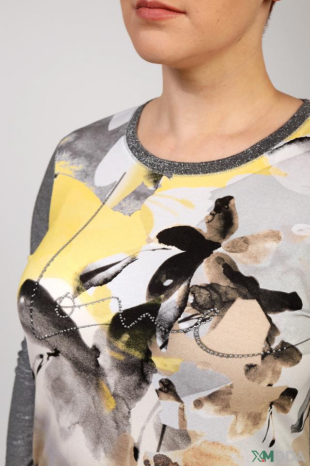 Женская футболка Rabe collection серого цвета с ярким абстрактным принтом. Модель выполнена из мягкой вискозы с добавлением металлизированной нити и эластана, обеспечивающих комфорт и приятный блеск. Состав: вискоза 59%, метализ.нить 38%, эластан 3%