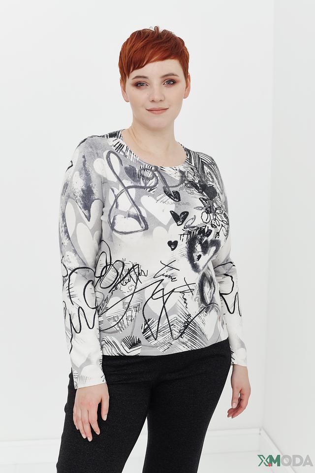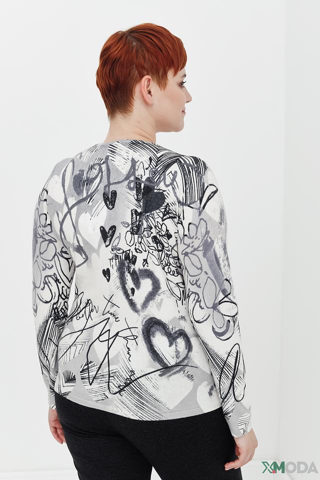 Пуловер имеет свободный крой, который не сковывает движений и позволяет создать расслабленный силуэт. Округлый вырез горловины и длинные рукава делают его универсальным для различных погодных условий. Основной цвет пуловера – светло-серый, а главным акцентом является яркий и необычный принт, состоящий из абстрактных рисунков, сердечек и надписей.