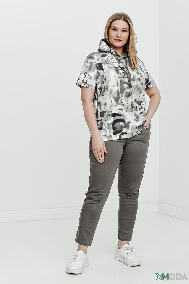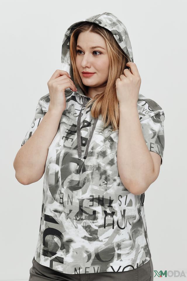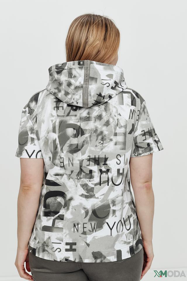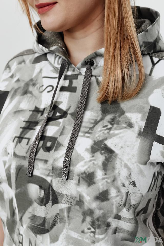 Джемпер имеет свободный крой, короткий рукав и удобный капюшон. Его особенностью является яркий принт, выполненный в серой гамме, который добавляет изделию оригинальности и динамики.