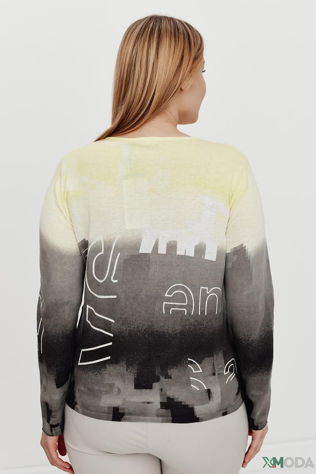 Пуловер имеет свободный крой и V-образный вырез горловины. Главная особенность модели – яркий принт, выполненный в технике градиента, сочетающий в себе светло-жёлтые, серые и чёрные оттенки. Принт изображает абстрактные фигуры, создавая современный и динамичный вид.