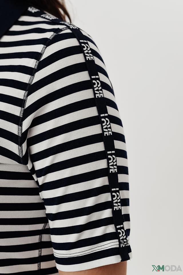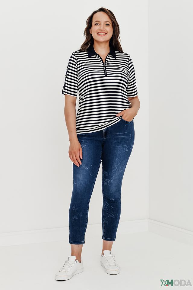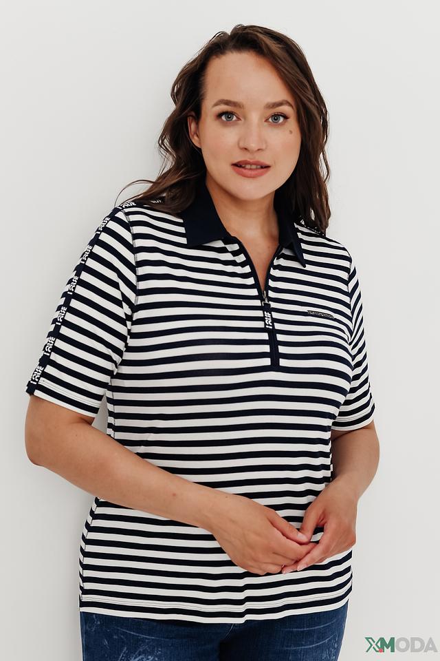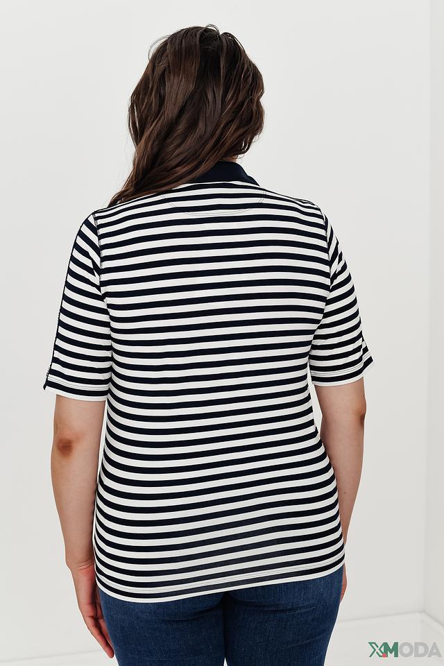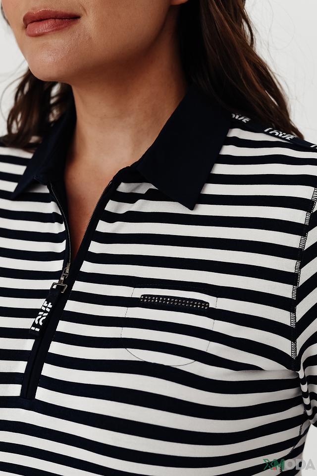 Женский джемпер Rabe collection сине-белого цвета с коротким рукавом и воротником-поло. Модель выполнена в классическую полоску и дополнена молнией. Состав: вискоза 96%, эластан 4%