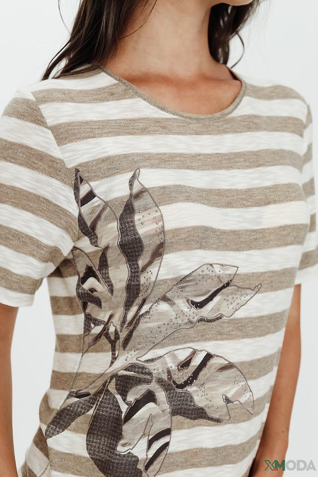 Модель имеет короткие рукава и круглый вырез горловины. Основной цвет пуловера – бежевый, дополненный светлыми полосками. Передняя часть украшена ярким цветочным принтом, который придает изделию индивидуальность и шарм.