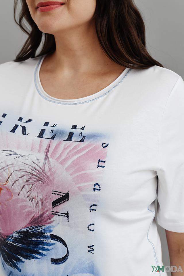 Белая футболка от Rabe collection с ярким цветочным принтом – отличный выбор для создания комфортного и стильного образа. Изготовлена из мягкого и приятного к телу сочетания хлопка и модала, обеспечивающего удобство в носке. Состав: хлопок 47%, модал 47%, эластан 6%