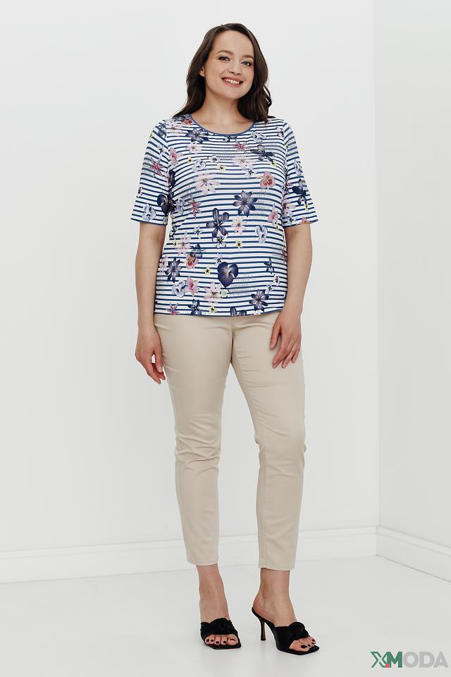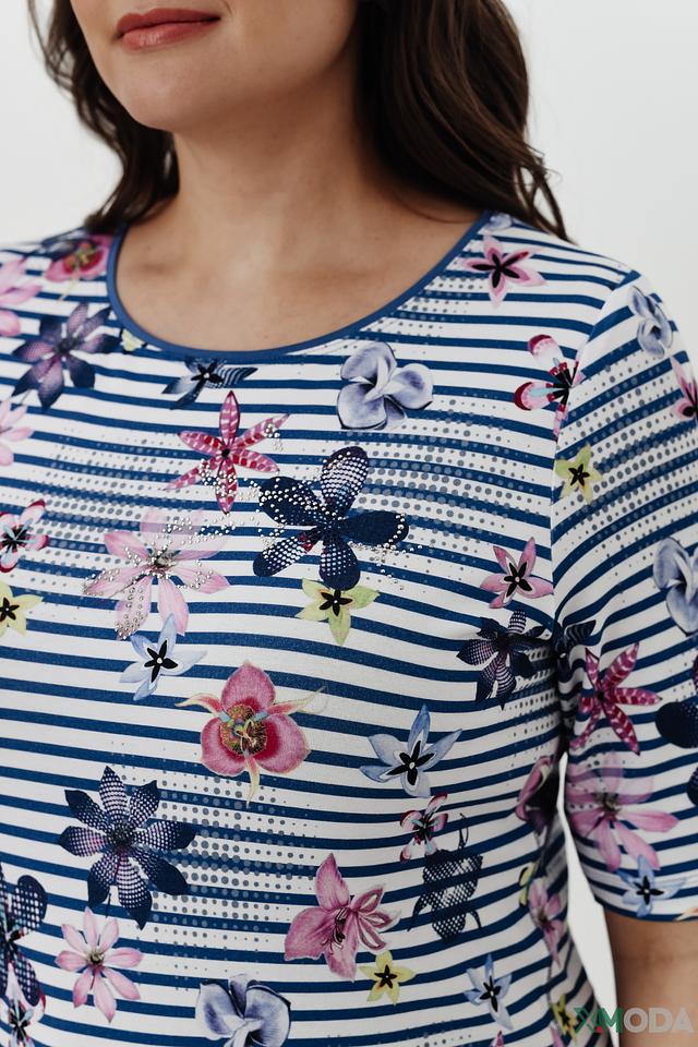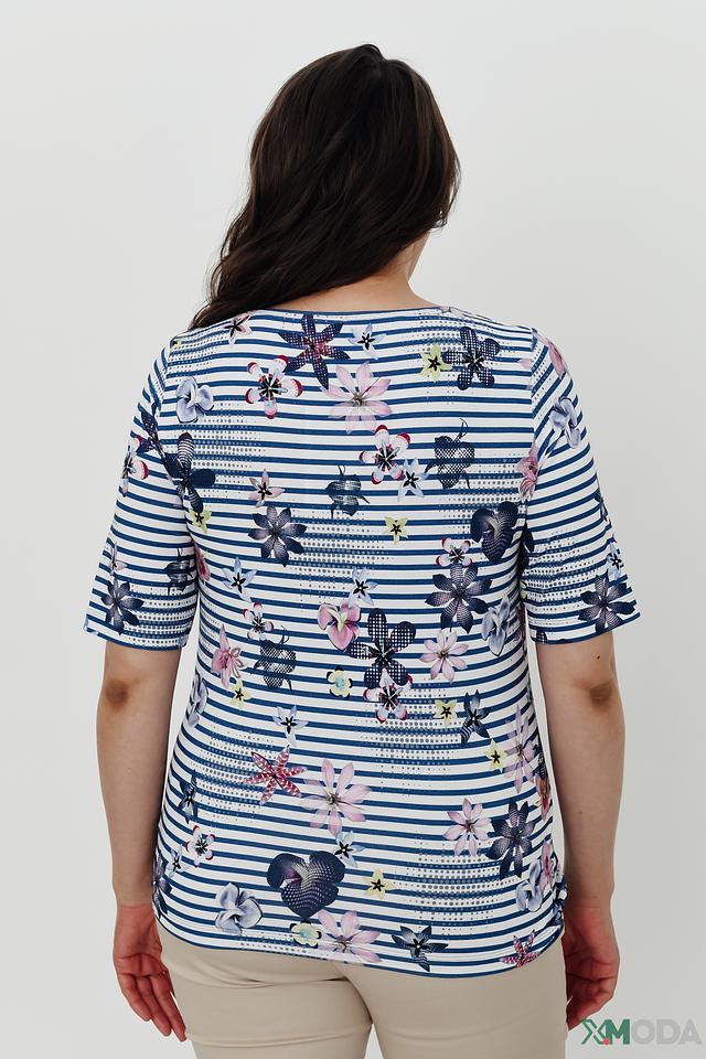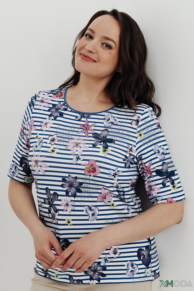 Блуза имеет классический крой с короткими рукавами и круглым вырезом горловины. Основной цвет блузы – синий, дополненный ярким цветочным принтом и белой полоской. Такой рисунок делает модель особенно привлекательной и женственной.