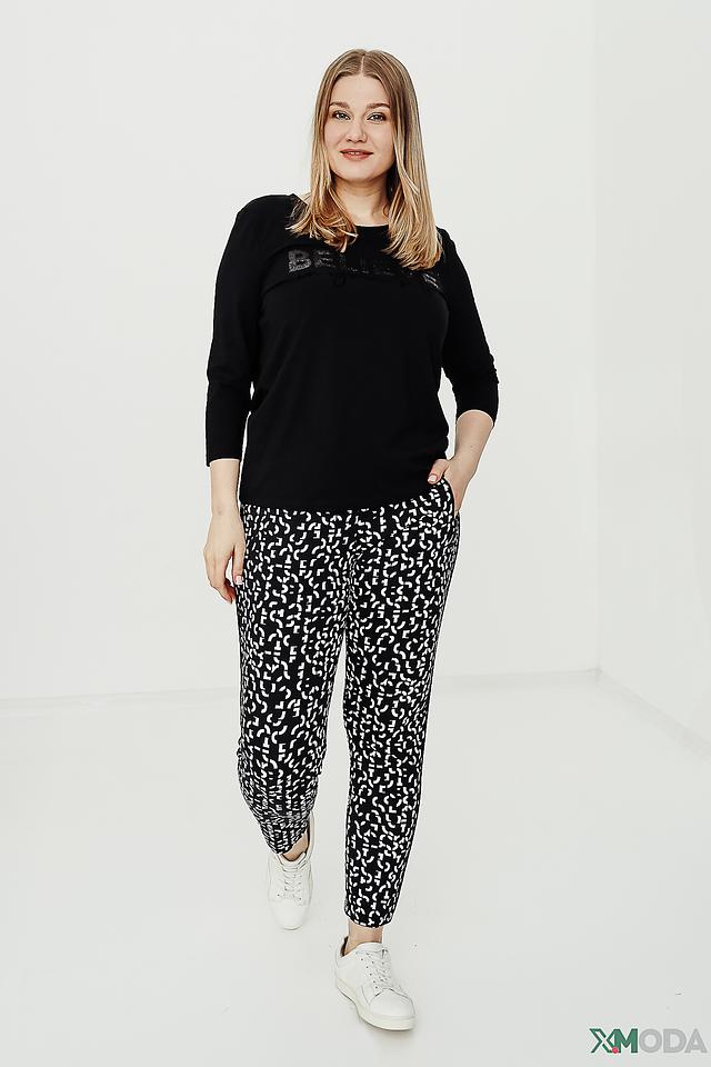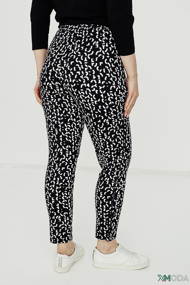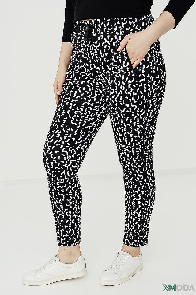 Женские трикотажные брюки Rabe collection чёрно-белого цвета с оригинальным геометрическим принтом. Модель выполнена из мягкой и приятной к телу ткани, обеспечивающей комфорт при носке. Удобная посадка и эластичный пояс. Состав: хлопок 48%, модал 48%, эластан 4%