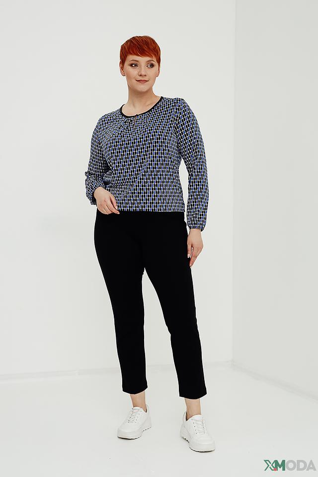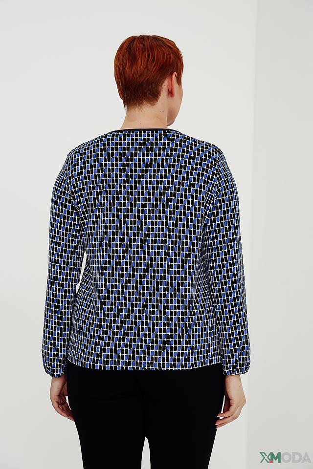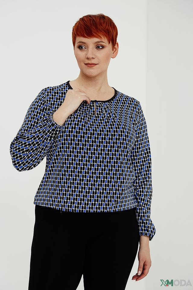 Блуза от Rabe collection синего цвета с геометрическим принтом. Модель с длинными рукавами и округлым вырезом горловины выполнена из мягкой вискозы с добавлением эластана. Состав: вискоза 92%, эластан 8%