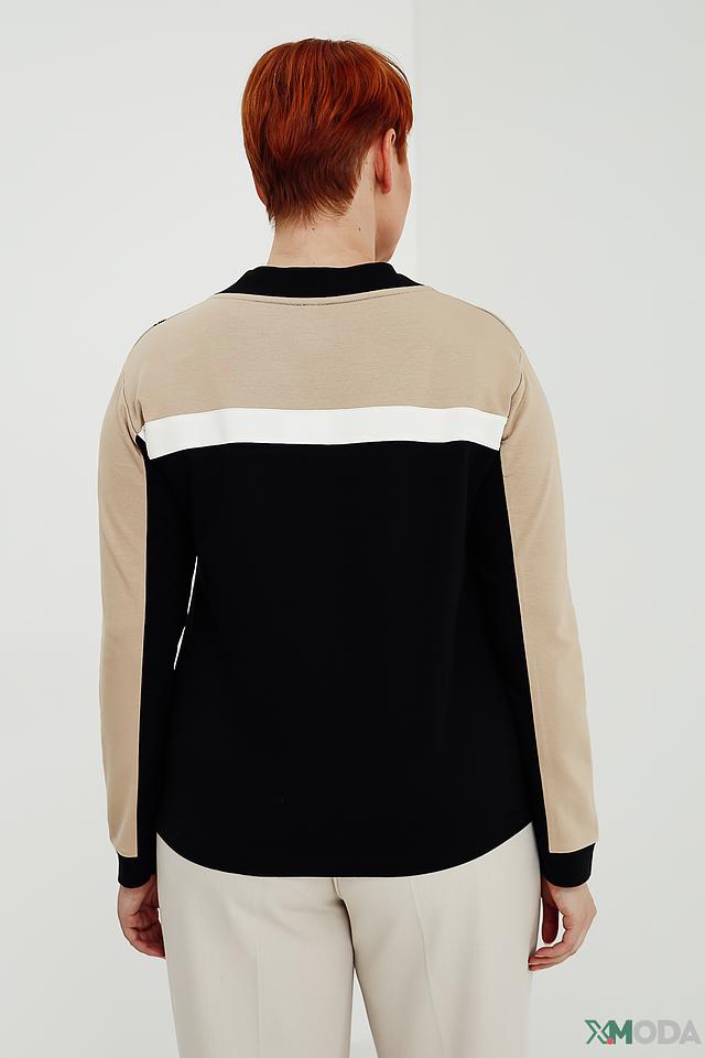 Состав ткани: 48% хлопок, 48% модал, 4% эластан. Хлопок обеспечивает воздухопроницаемость и комфорт, модал придает мягкость и шелковистость, а эластан – эластичность и хорошую посадку по фигуре. Пуловер приятен к телу и прост в уходе.