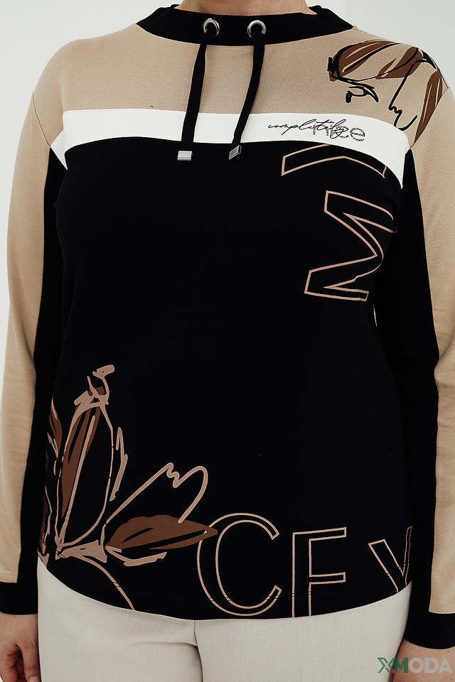 Чёрный пуловер от Rabe collection с оригинальным принтом и бежевой отделкой. Модель выполнена из мягкого и приятного к телу сочетания хлопка, модала и эластана, обеспечивающего комфорт при носке. Состав: хлопок 48%, модал 48%, эластан 4%