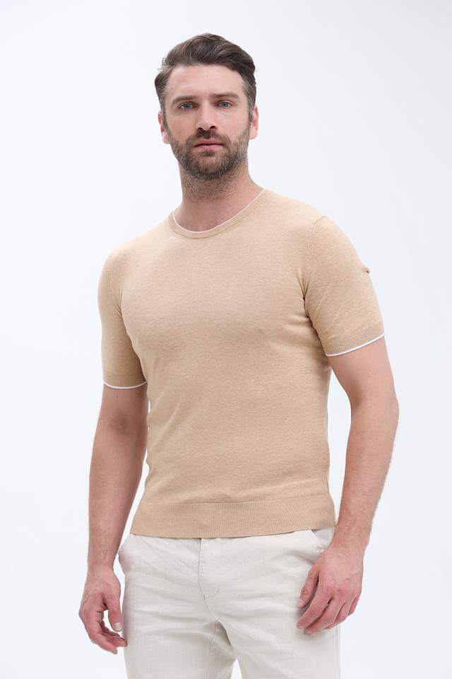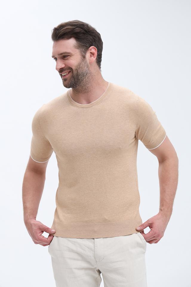 Модель имеет классический крой с круглым вырезом горловины и короткими рукавами, что идеально подходит для теплой погоды или в качестве элемента многослойного образа.