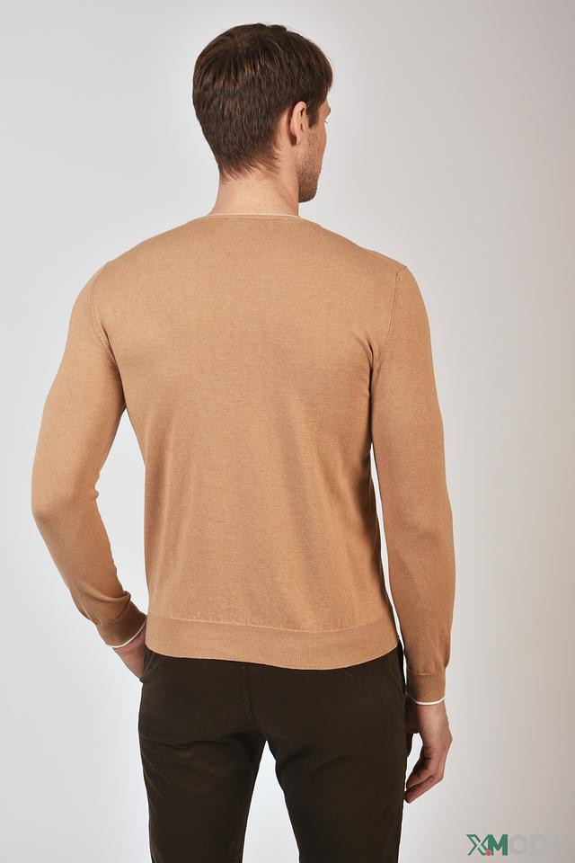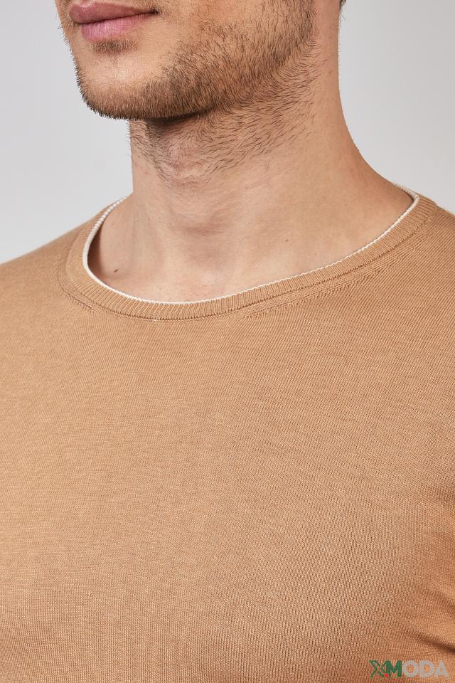 Цвет джемпера – бежевый, спокойный и универсальный, легко сочетается с различными элементами гардероба. Отличительной особенностью является светлая бежевая отделка горловины и манжет, придающая изделию завершенный вид.