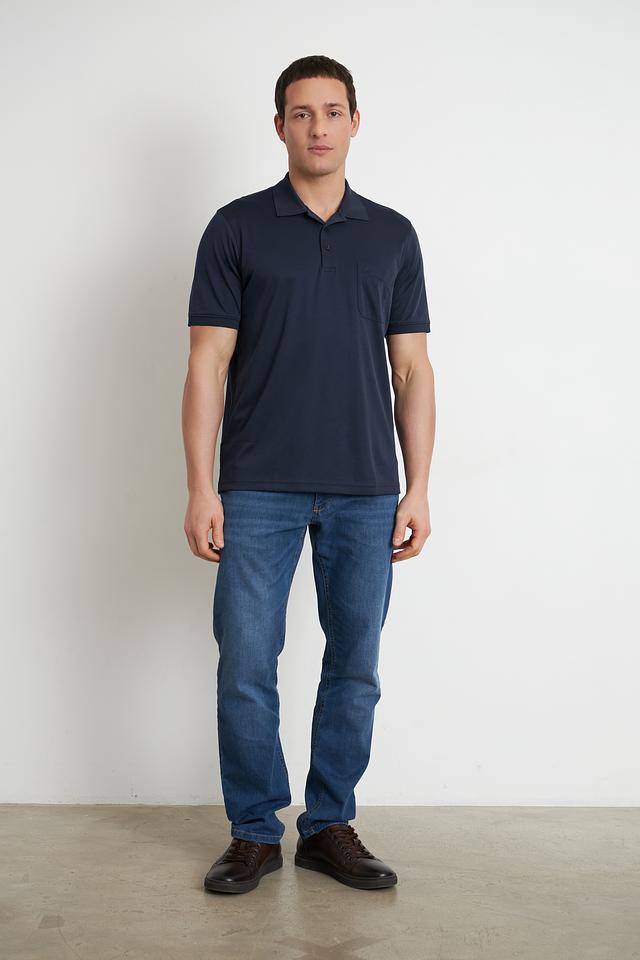 Модель имеет короткий рукав и стандартный крой, обеспечивающий свободу движений. Воротник поло выполнен из эластичного материала, что гарантирует комфортную посадку по фигуре. На груди расположена небольшая планка с пуговицами.