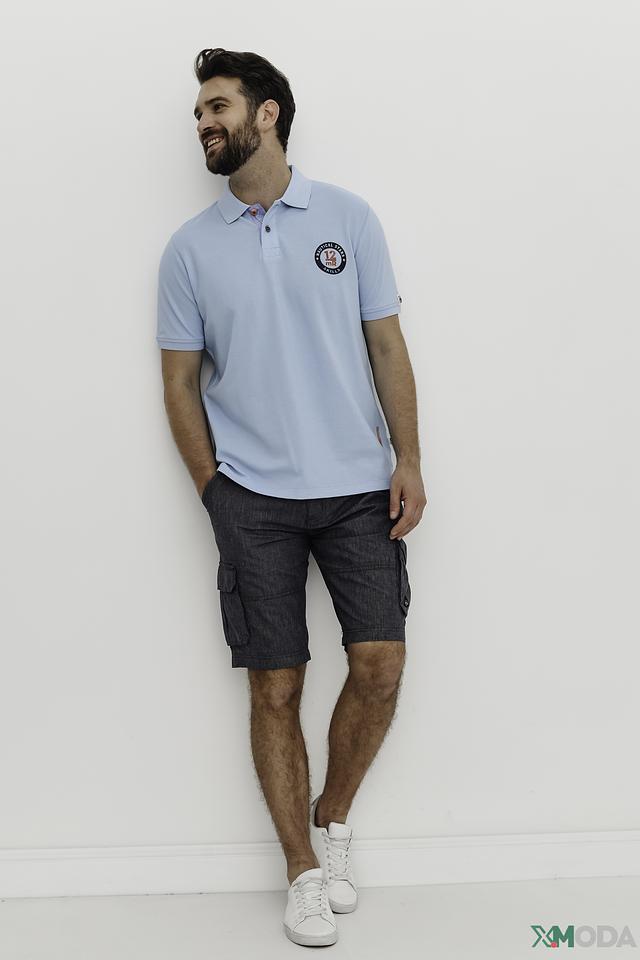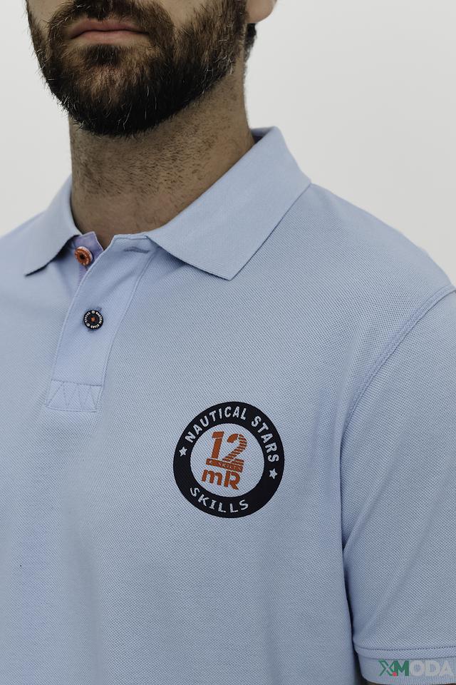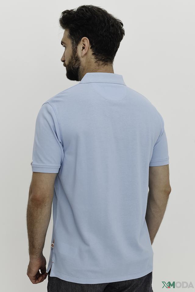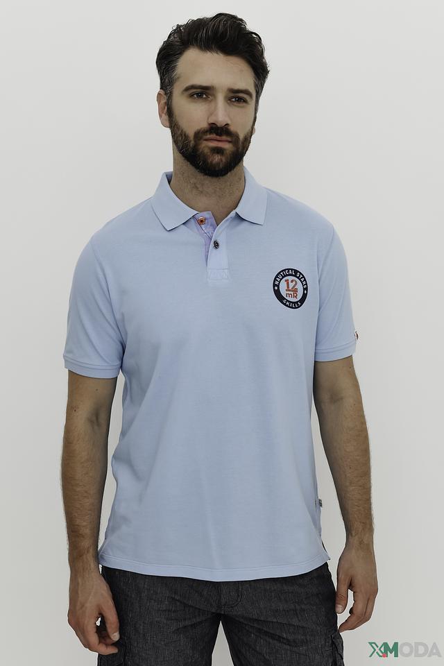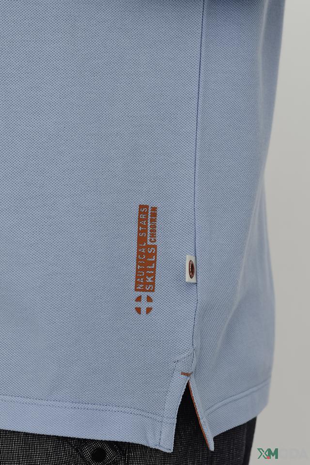 Поло выполнено из 100% хлопка, что обеспечивает мягкость, воздухопроницаемость и приятные тактильные ощущения. На груди расположена декоративная круглая эмблема с логотипом бренда, выполненная в тёмно-синих и белых тонах. Воротник поло классической формы, застёжка на две пуговицы.