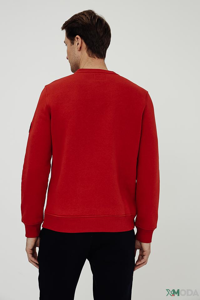 Модель имеет классический крой с круглым вырезом горловины и длинными рукавами. На левой стороне груди расположен небольшой декоративный элемент – нашивка с логотипом бренда.