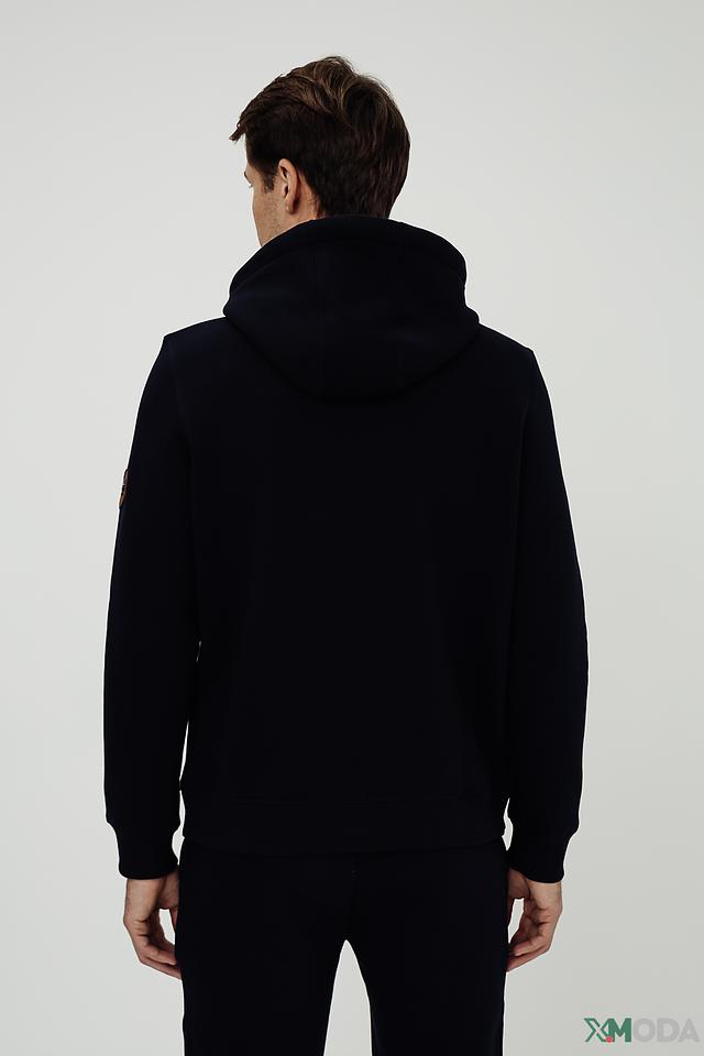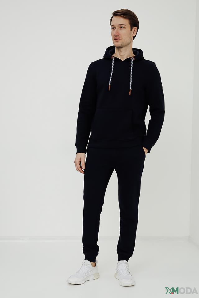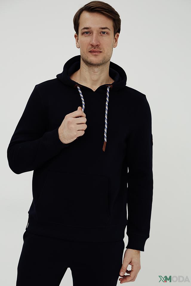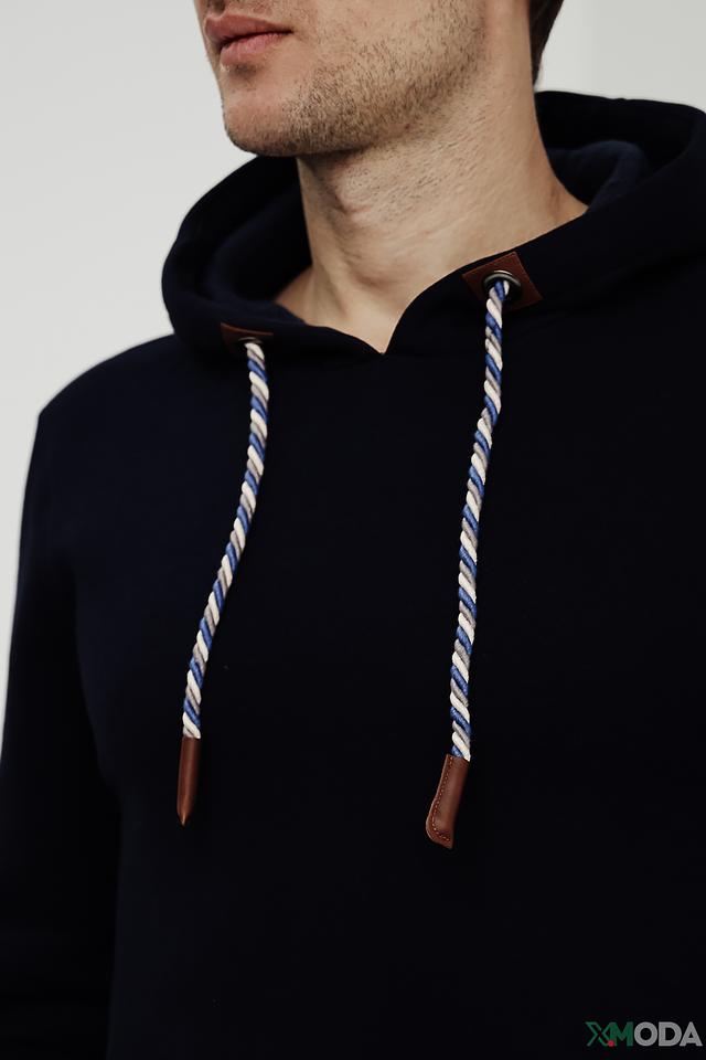 Толстовка имеет удобный капюшон со шнурками, которые дополнены декоративными вставками в бело-синюю полоску и коричневыми наконечниками. Крой обеспечивает свободу движений, а мягкий хлопок с добавлением полиэстера дарит комфорт в носке.