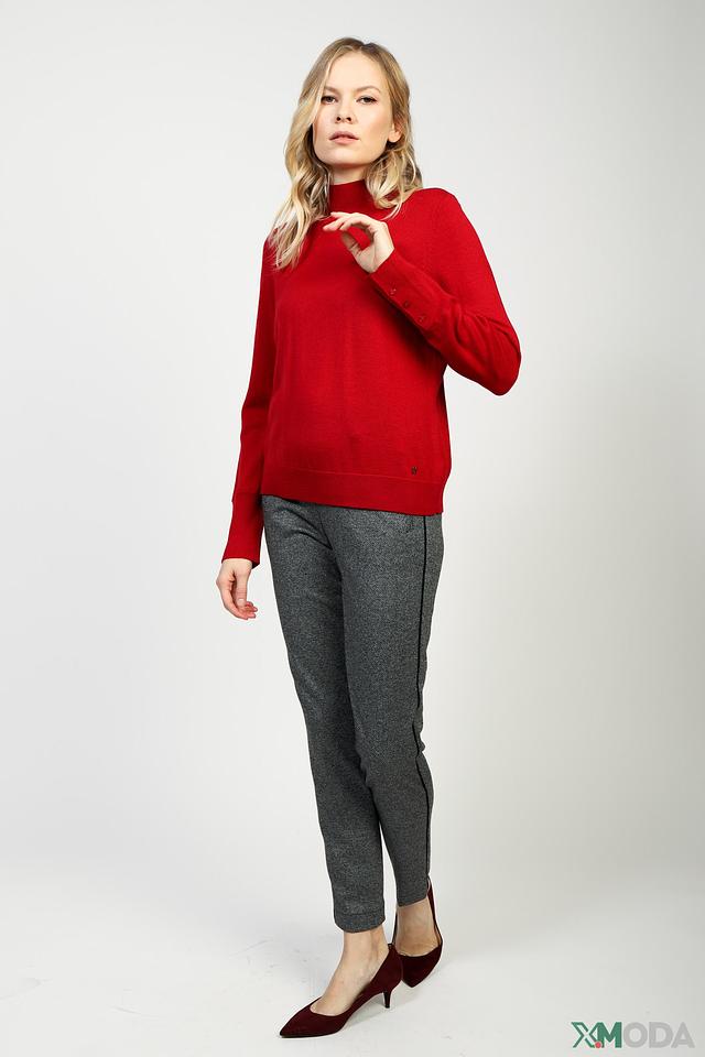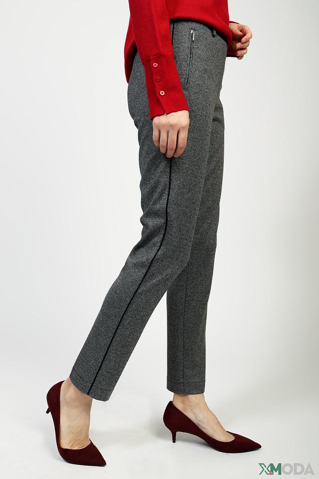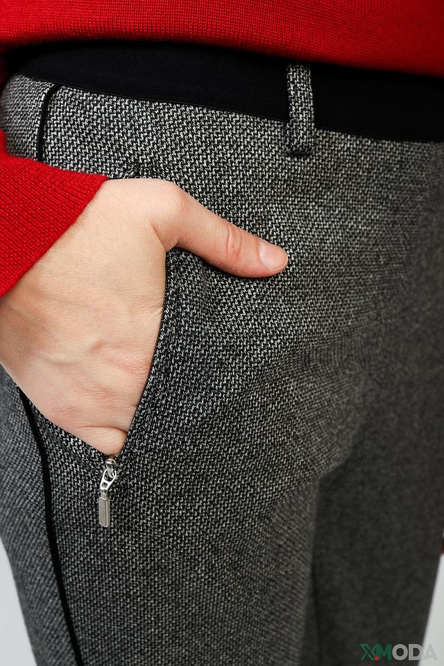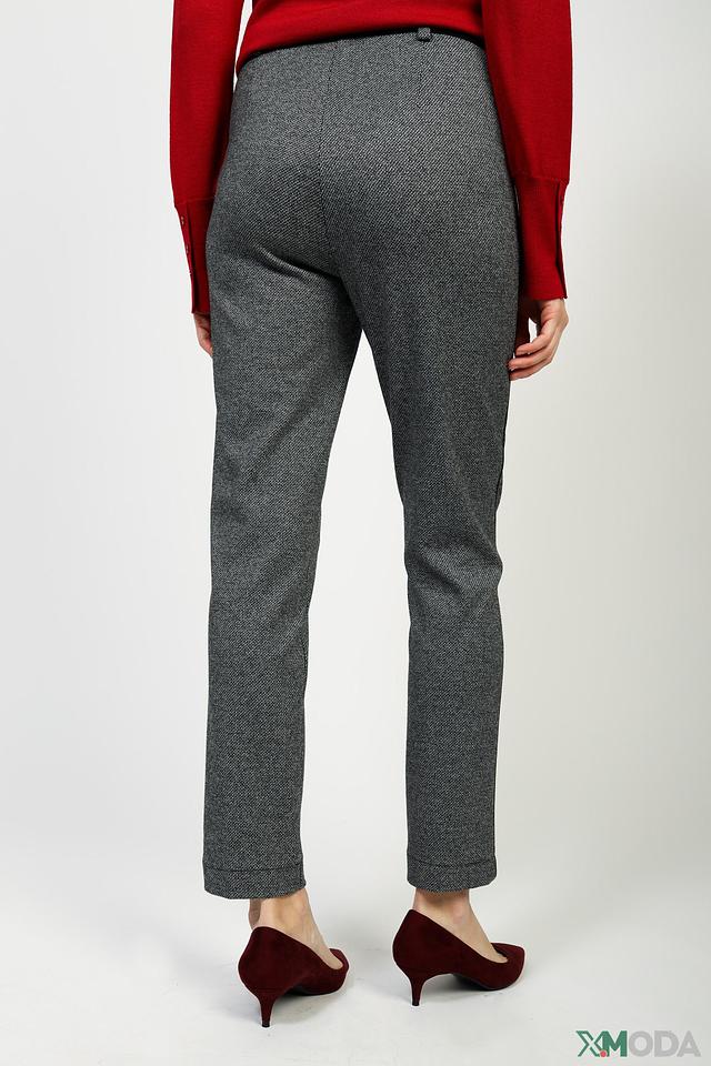 Основной цвет брюк – серый, с выразительным клетчатым рисунком. Ткань отличается мягкостью и приятными тактильными ощущениями благодаря составу: 55% вискоза, 43% полиэстер и 2% эластан. Наличие эластана обеспечивает хорошую посадку по фигуре и не сковывает движения.