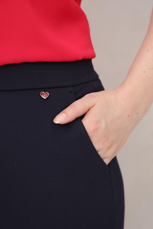 Ткань, из которой изготовлены брюки, состоит из полиамида, вискозы и эластана. Это сочетание обеспечивает комфорт при носке, хорошую посадку и устойчивость к сминанию. На поясе расположена декоративная металлическая деталь в форме сердца, добавляющая образу изысканности.