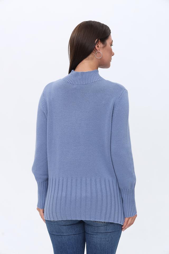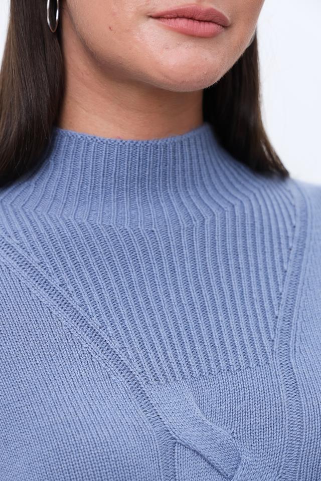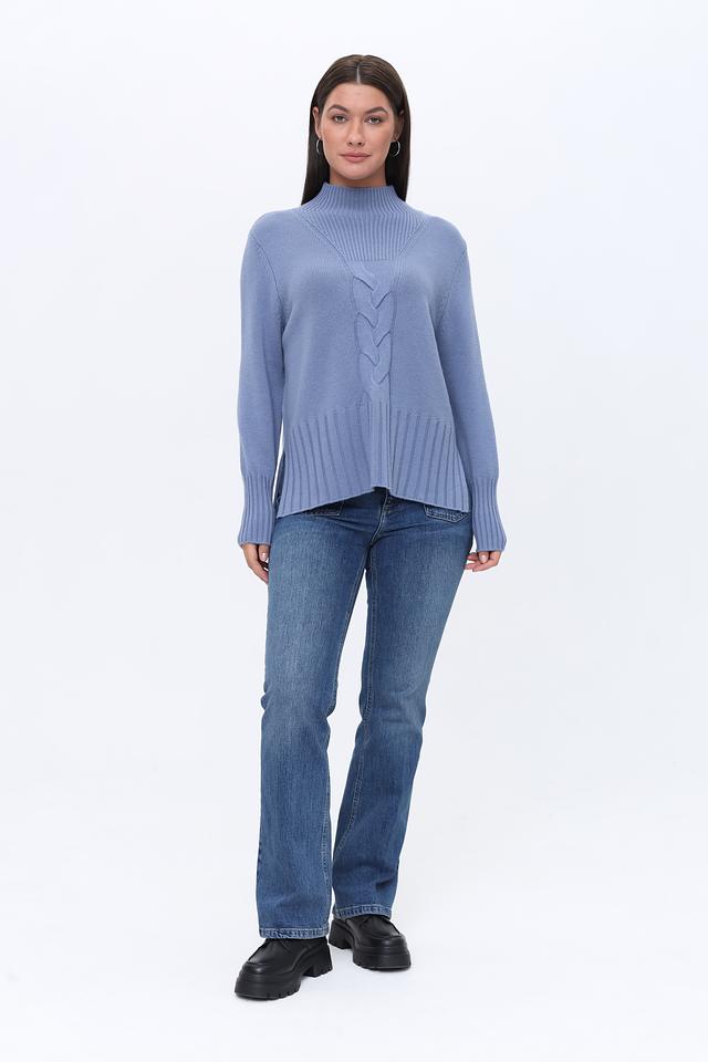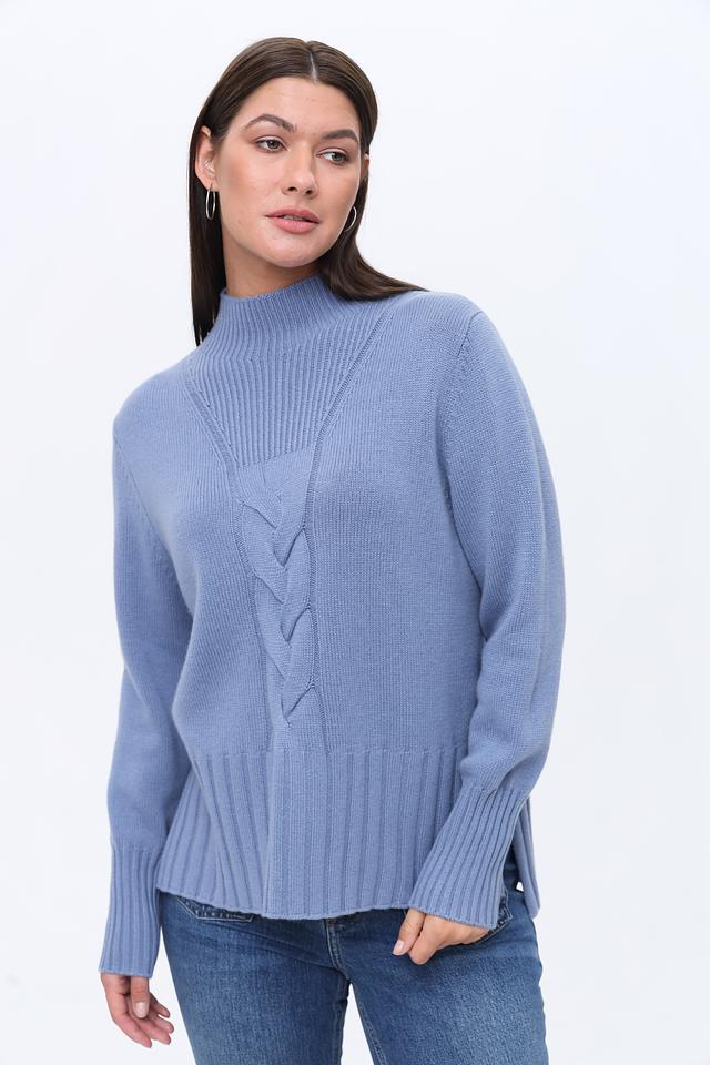 Пуловер имеет голубой цвет и классический крой с высоким горлом. Декоративные косы придают изделию особый шарм и изысканность. Рукава и низ пуловера выполнены резинкой, что обеспечивает удобную посадку по фигуре.