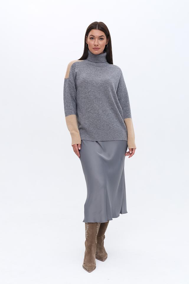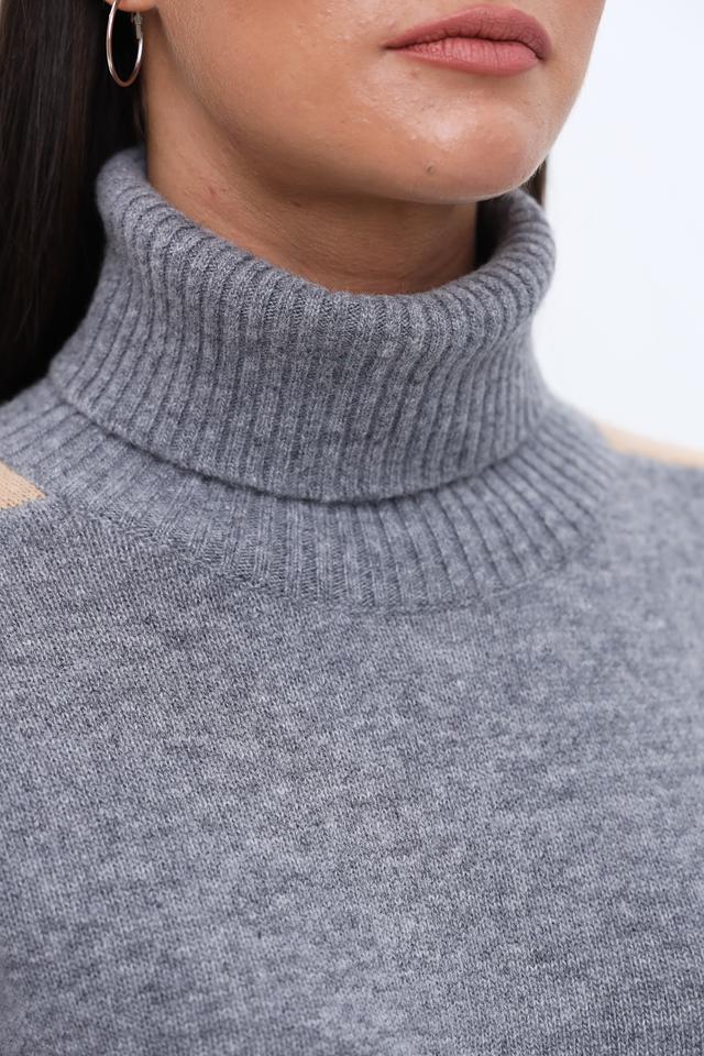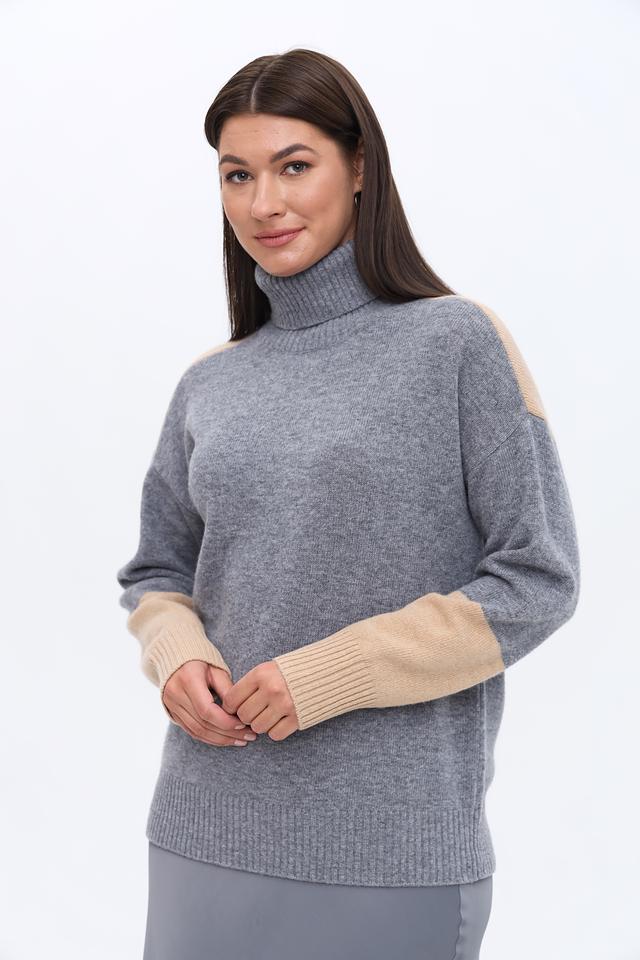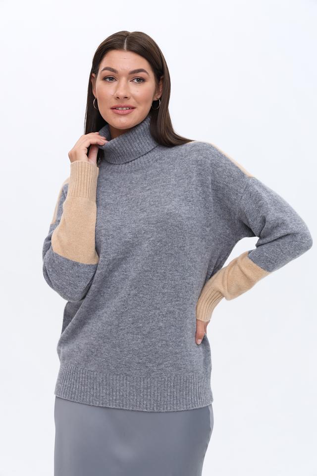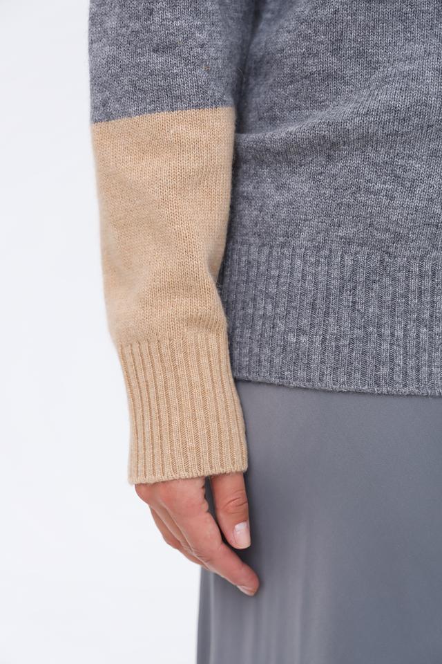 Особенностью данного пуловера является сочетание серого и бежевого цветов. Основная часть изделия выполнена в сером цвете, а рукава – в бежевом, что создает интересный контрастный эффект. Высокий воротник добавляет элегантности и защищает от холода.