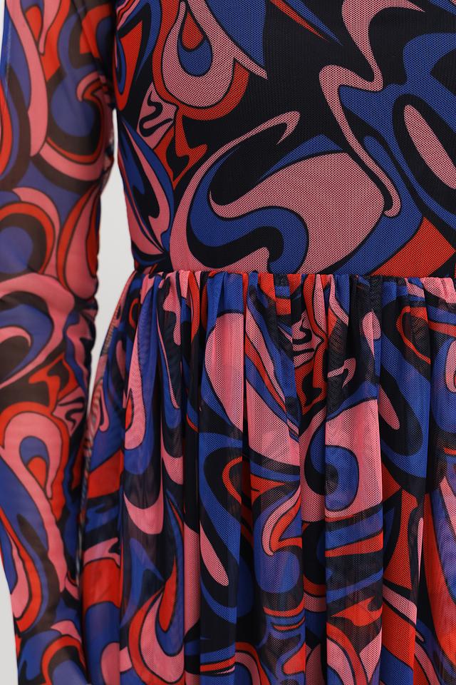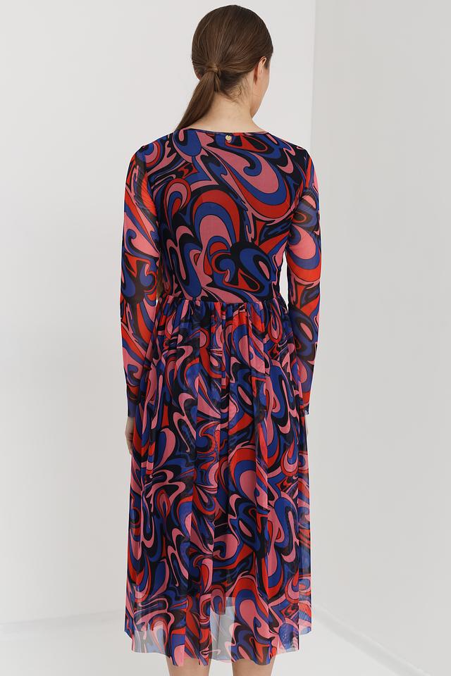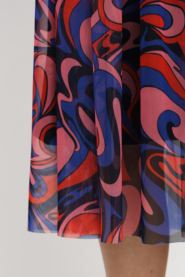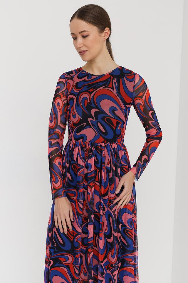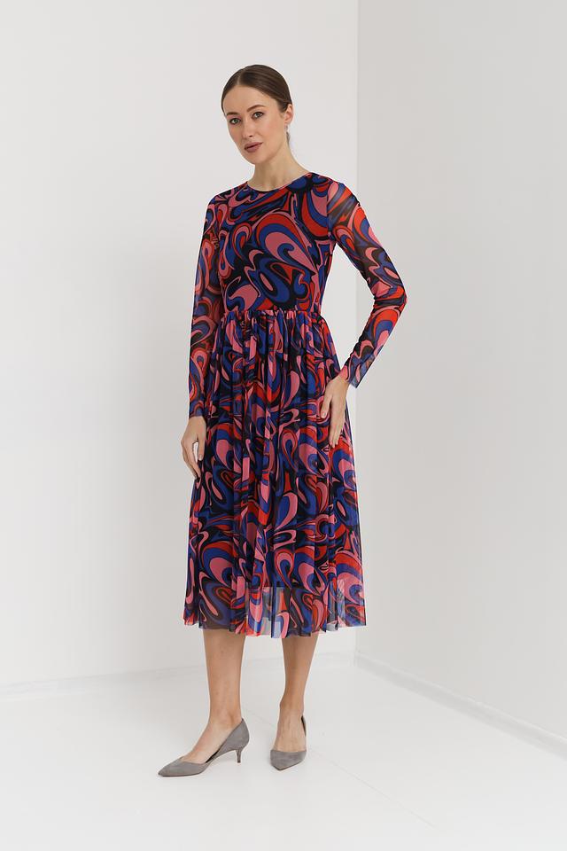 Модель имеет длинные рукава и круглый вырез горловины. Особое внимание привлекает яркий абстрактный принт, выполненный в синих, красных и розовых тонах. Плиссированная юбка из полупрозрачной ткани добавляет образу легкости и воздушности.
