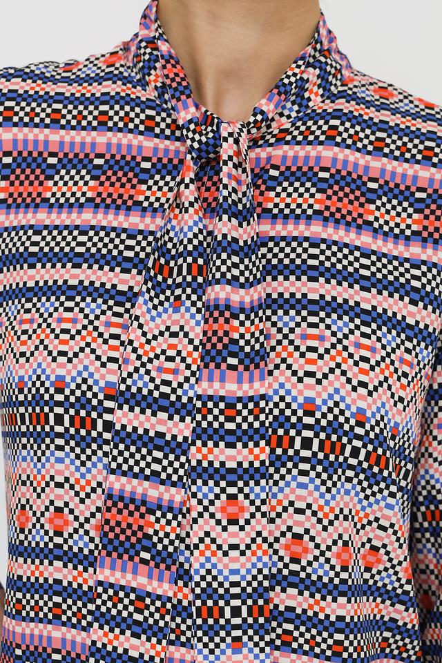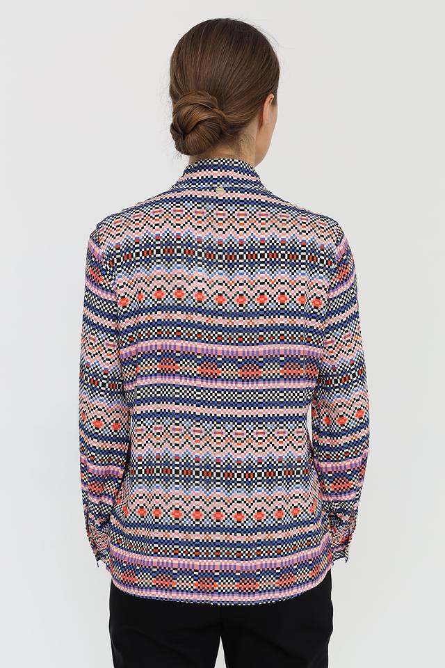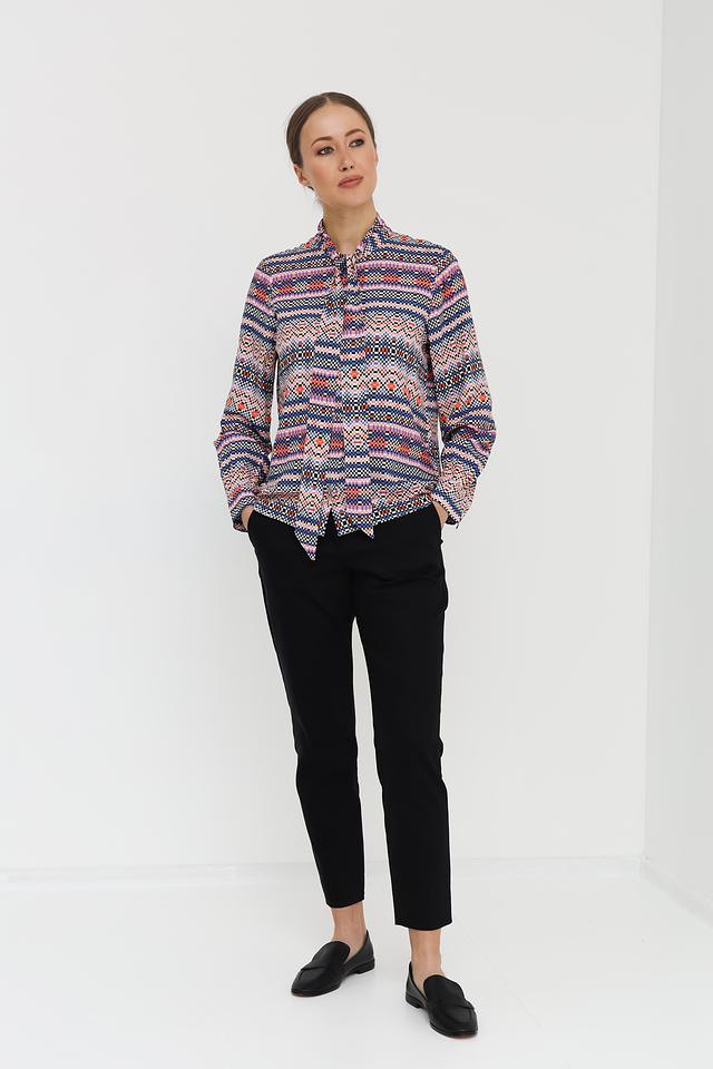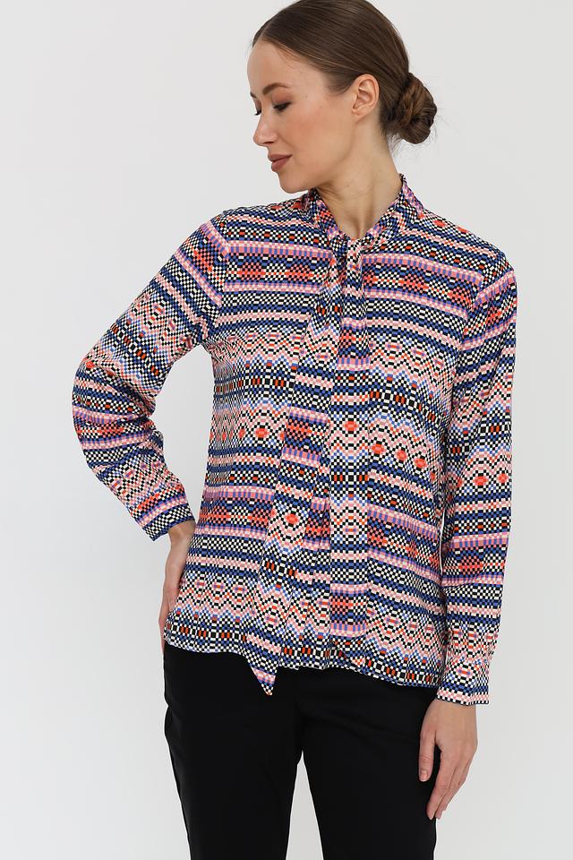 Основной цвет блузки – синий, но она украшена красочным геометрическим принтом, включающим в себя оттенки розового, оранжевого, белого и черного. Принт создает динамичный и современный вид.