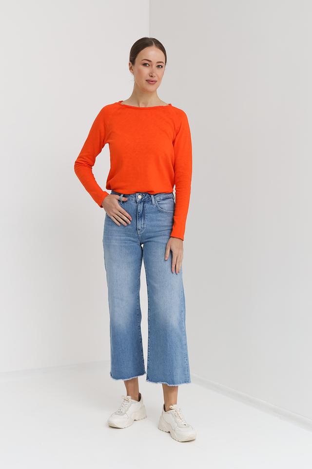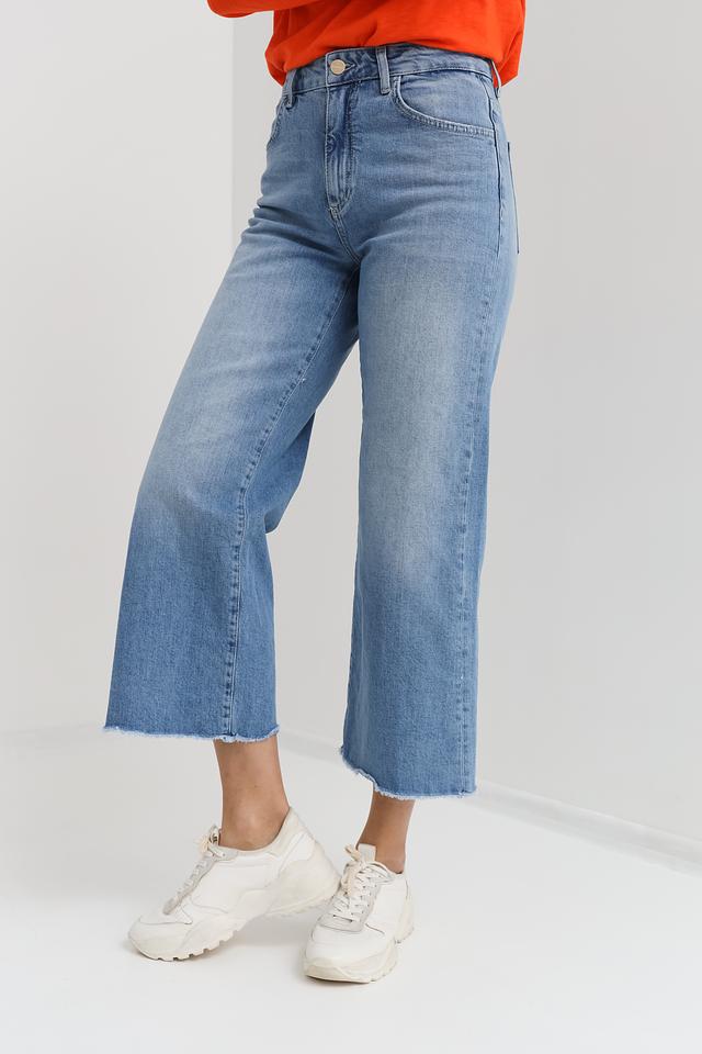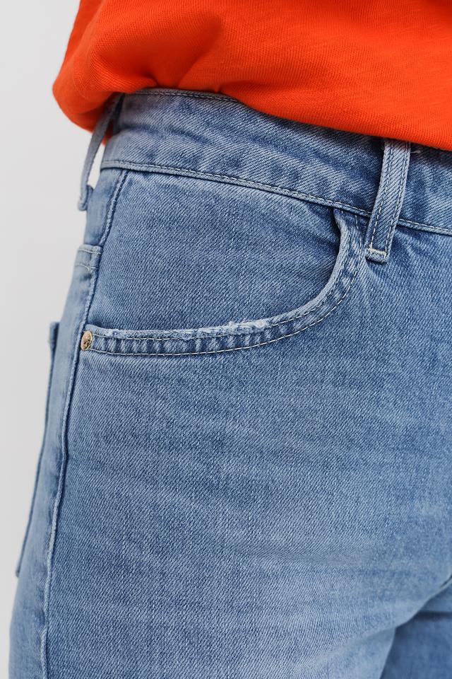 Джинсы имеют высокую посадку, подчеркивающую талию, и свободный крой, обеспечивающий свободу движений. Необработанный низ придает джинсам непринужденный и современный вид. Цвет джинсов — голубой, универсальный и легко сочетаемый с различными элементами гардероба.