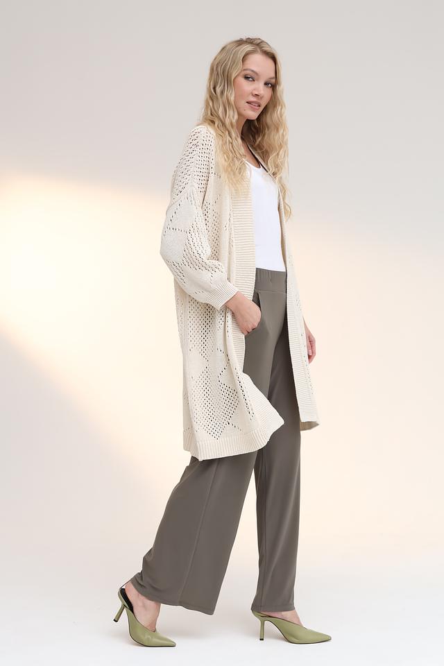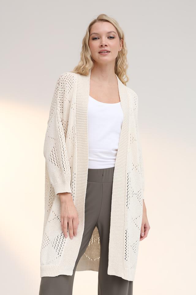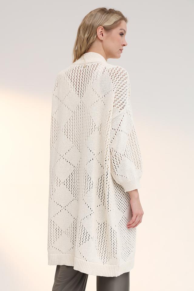 Особенностью модели является ажурный узор, который придает ей легкость и воздушность. Кардиган имеет длинные рукава и открытую конструкцию, что делает его идеальным для прохладной погоды.