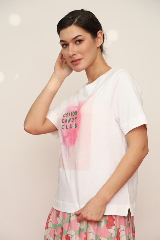 Особенностью данной модели является яркий принт "Cotton Candy Club", выполненный в нежных розовых и зелёных тонах. Принт добавляет игривости и оригинальности. Крой футболки свободный, что обеспечивает свободу движений и позволяет сочетать её с различными элементами гардероба.